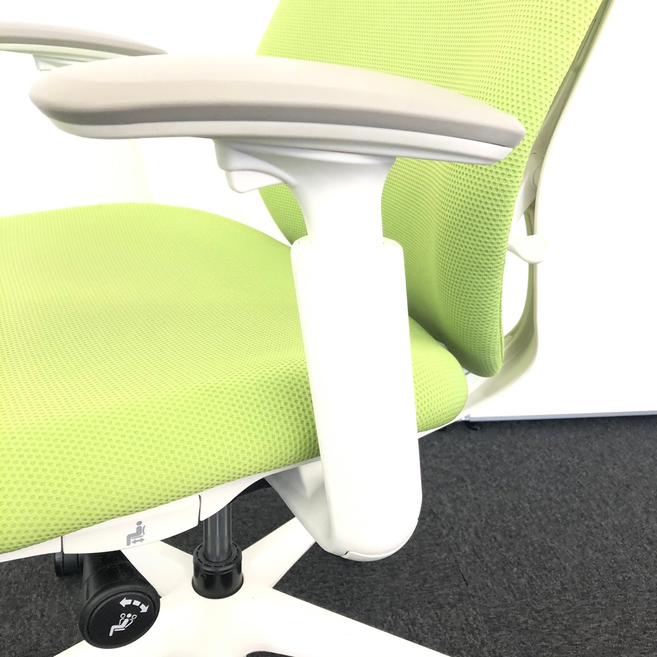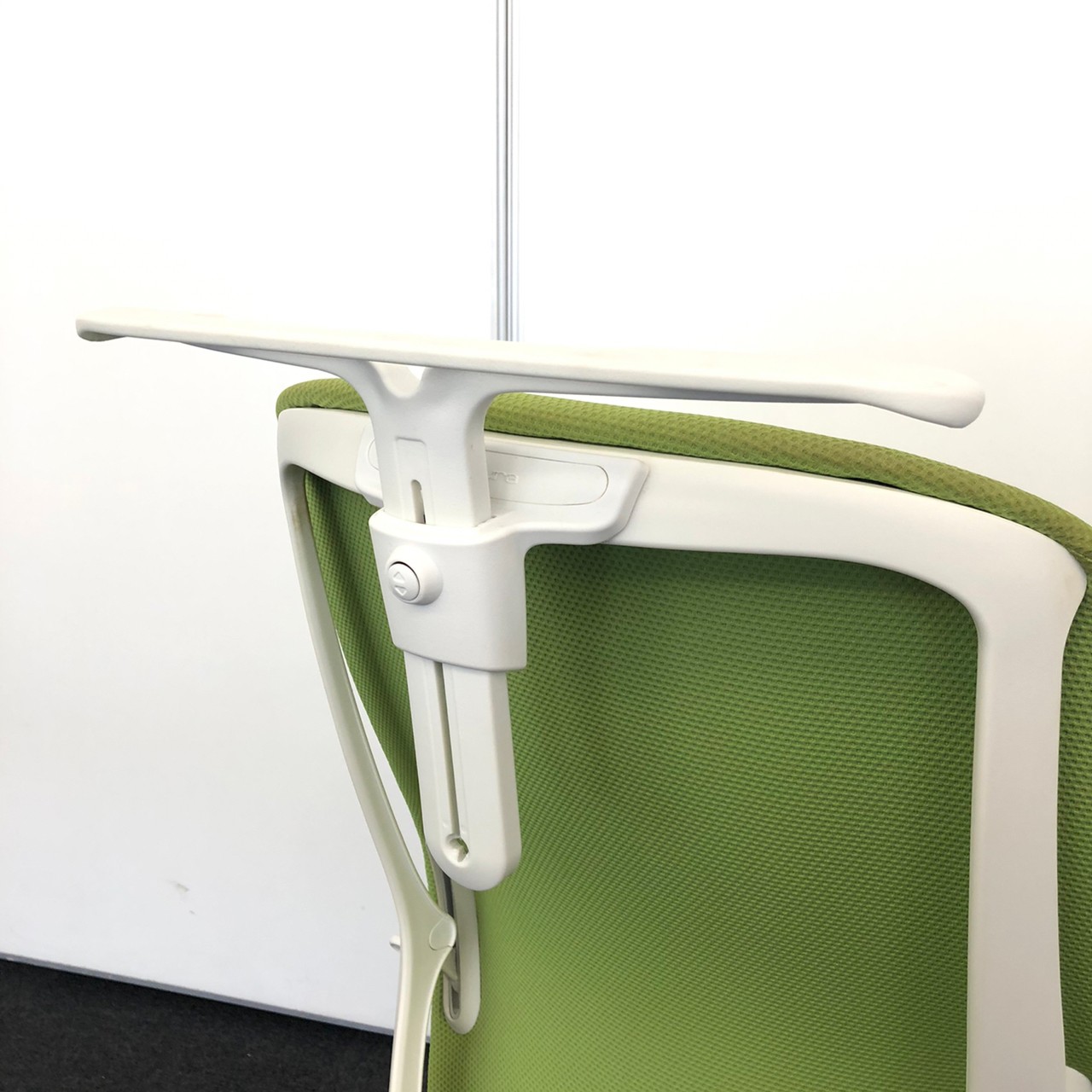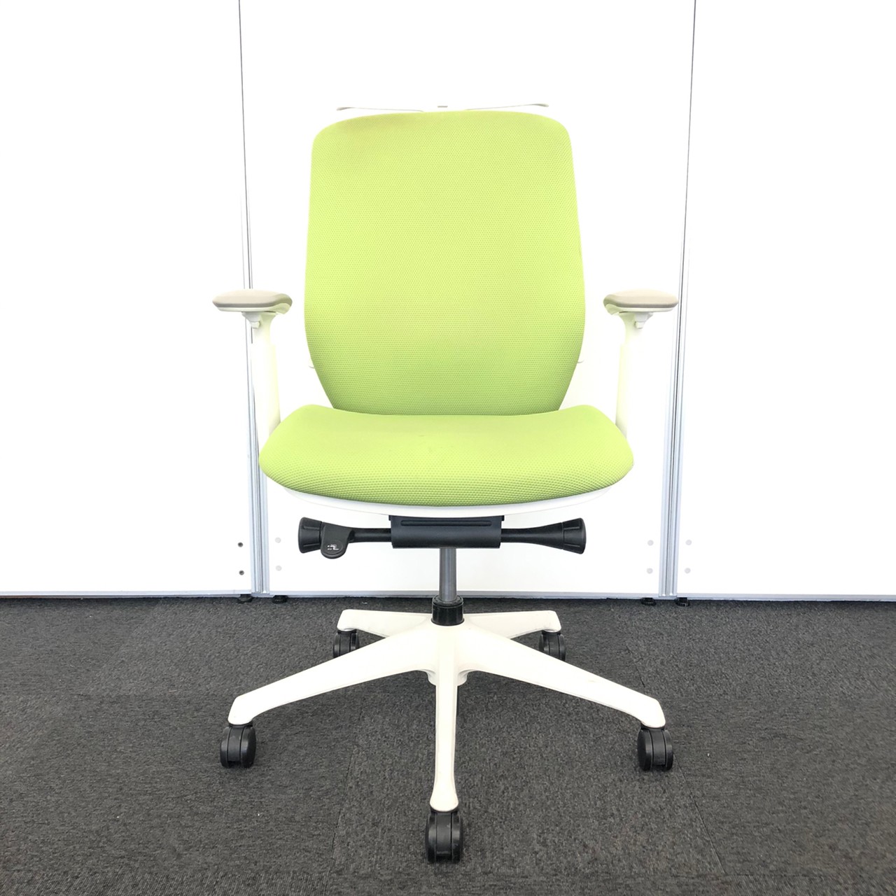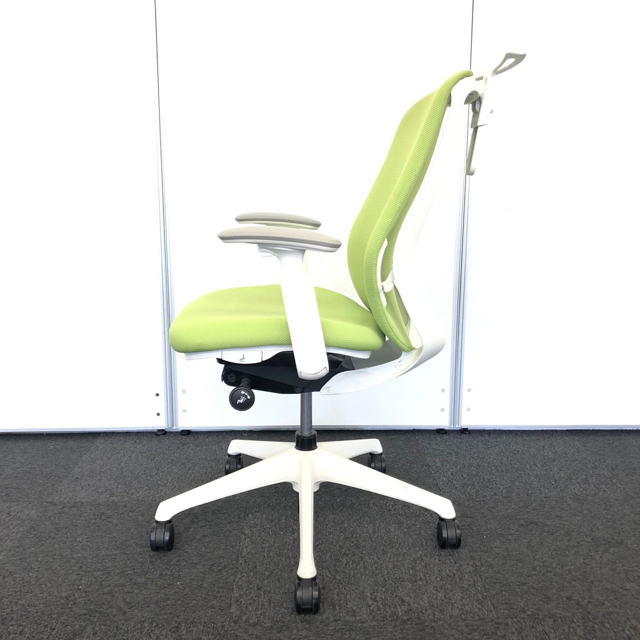 【背のカーブを変えられる新感覚のオフィスシーティング】■オカムラ製 シルフィーチェア 可動肘付 ライムグリーン ハンガー付- 川崎店