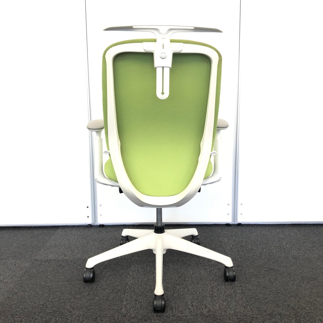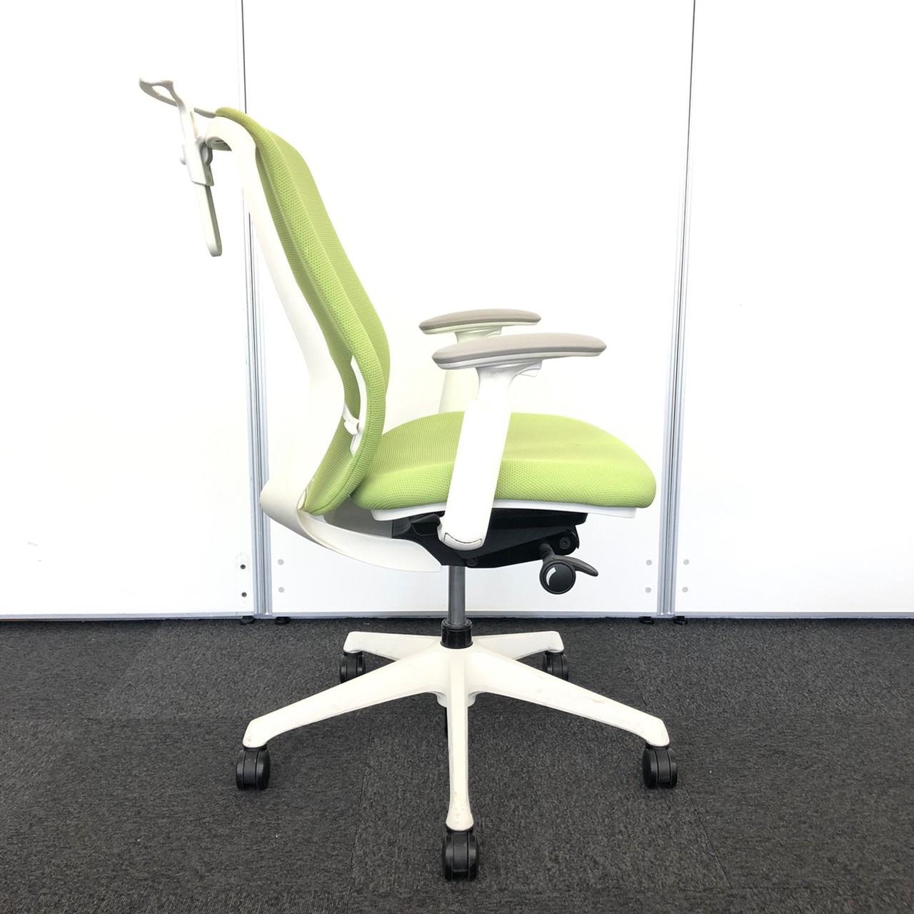 【在庫入替セール品】【人気のシルフィチェアヘッドレスト付きが1脚限定入荷!】オカムラ シルフィ ライムグリーン エクストラハイバック ホワイトフレーム デザインアーム(固定肘) 前傾チルト機能付き