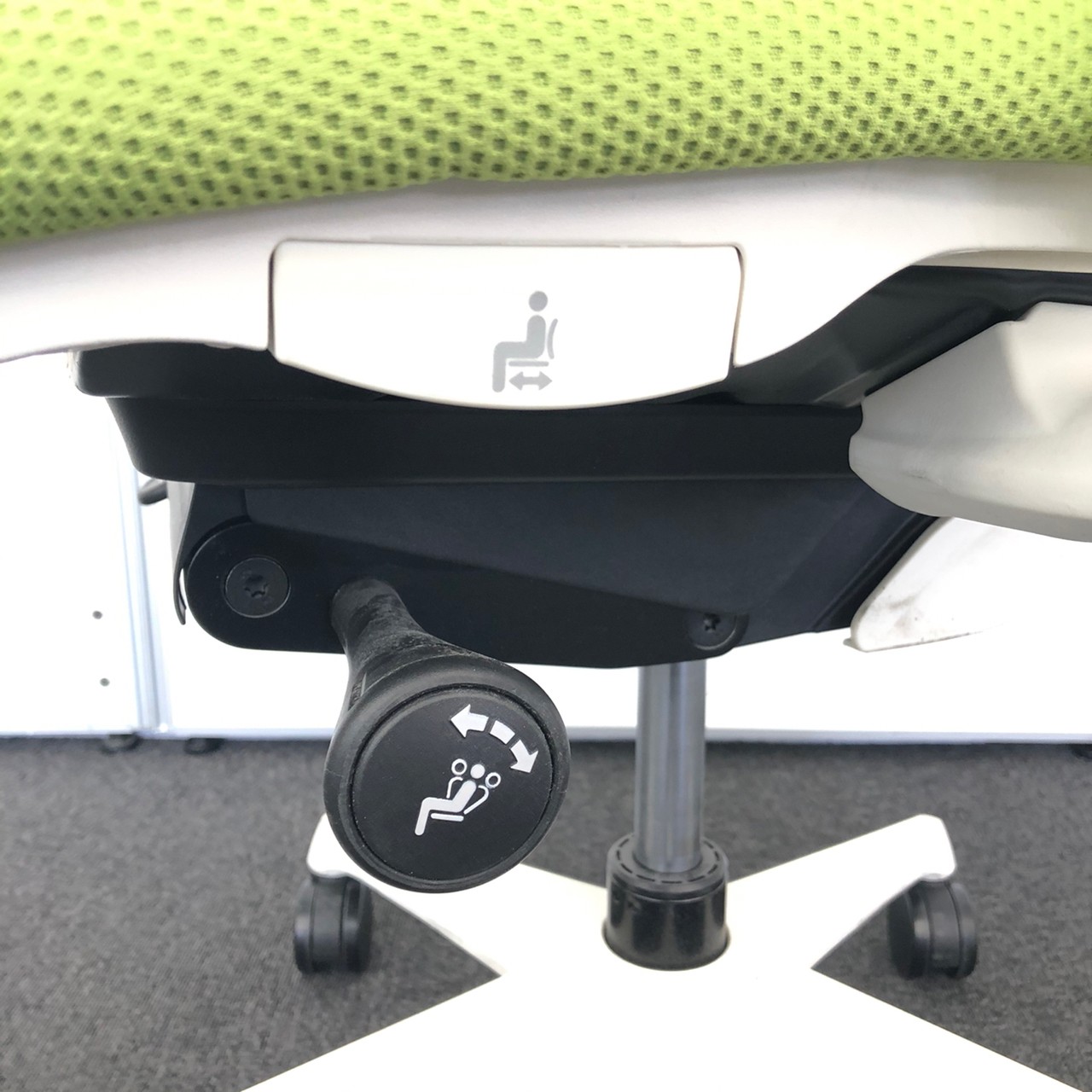 - 座面の左にあるレバー操作により、座面の奥行き調整が可能です。(ストローク:50mm)