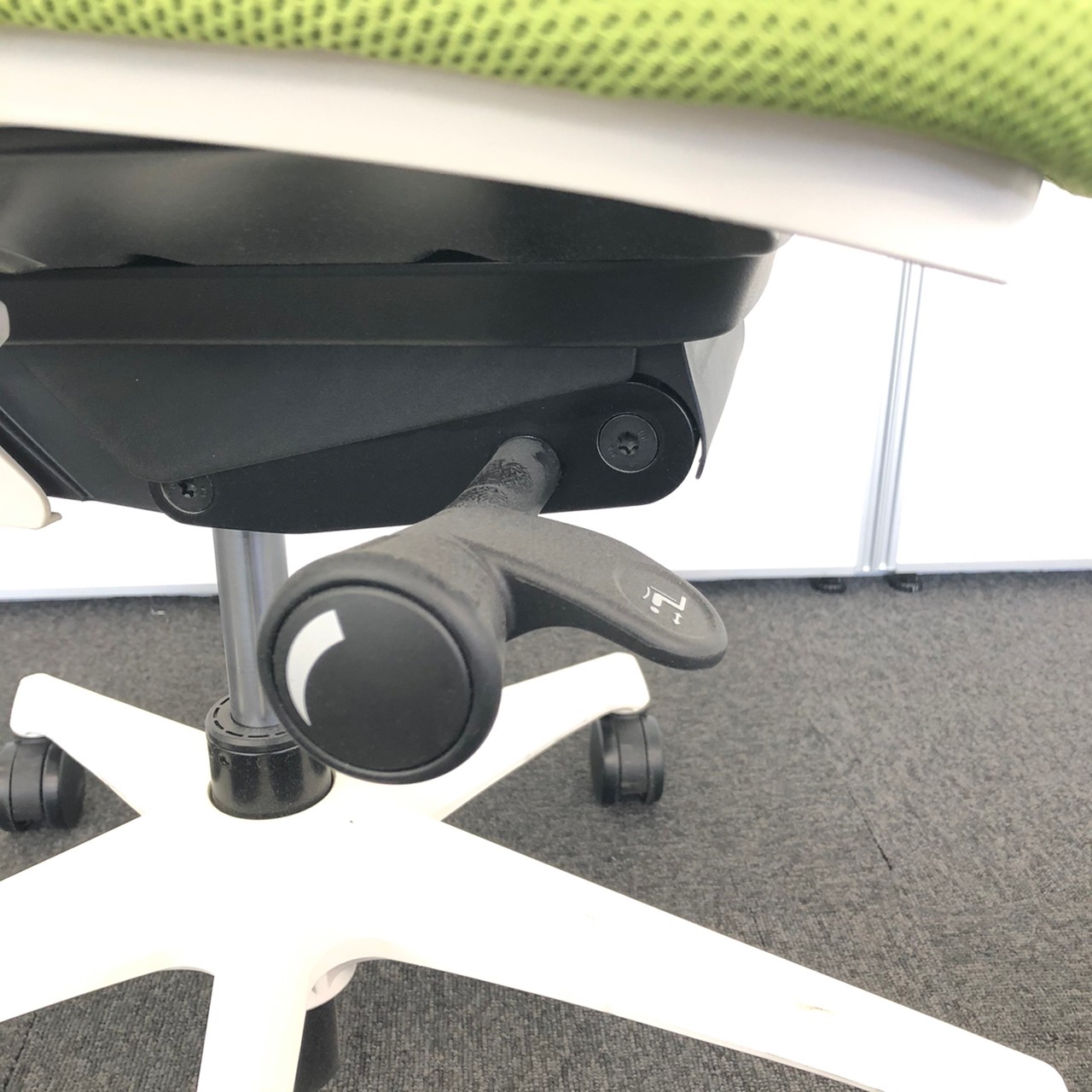 - 座面右下のダイヤル操作で、リクライニングの強弱調整が行えます。これまでのダイヤル式よりも、少ない回転数で、最弱?最強の調整が可能です。