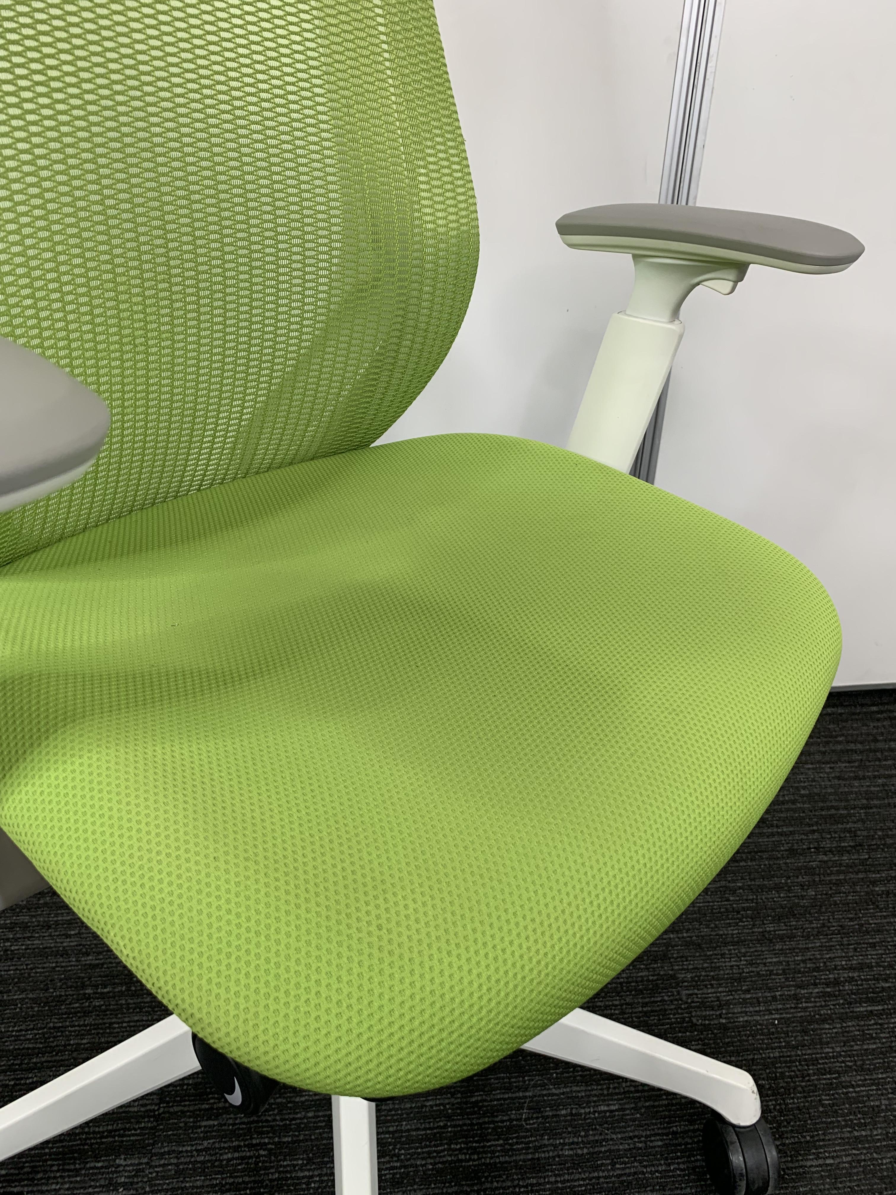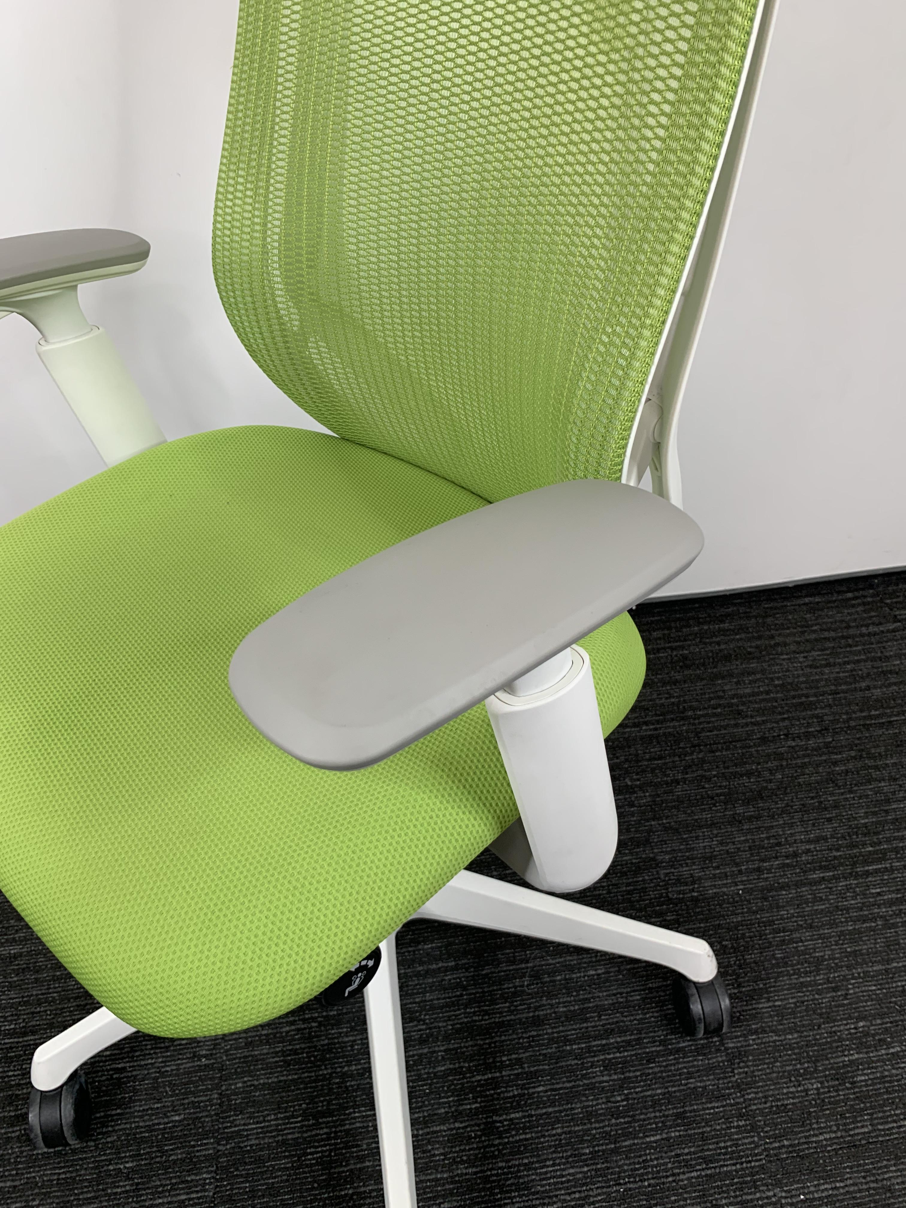 【前傾チルト機能付き!オカムラ製品で最も人気を集める高機能メッシュチェア!】■オカムラ(okamura)製 シルフィ(Sylphy)チェア ハイバック 肘付き ■可動肘 ■ライムグリーン × ホワイトシェル【状態良好品!】