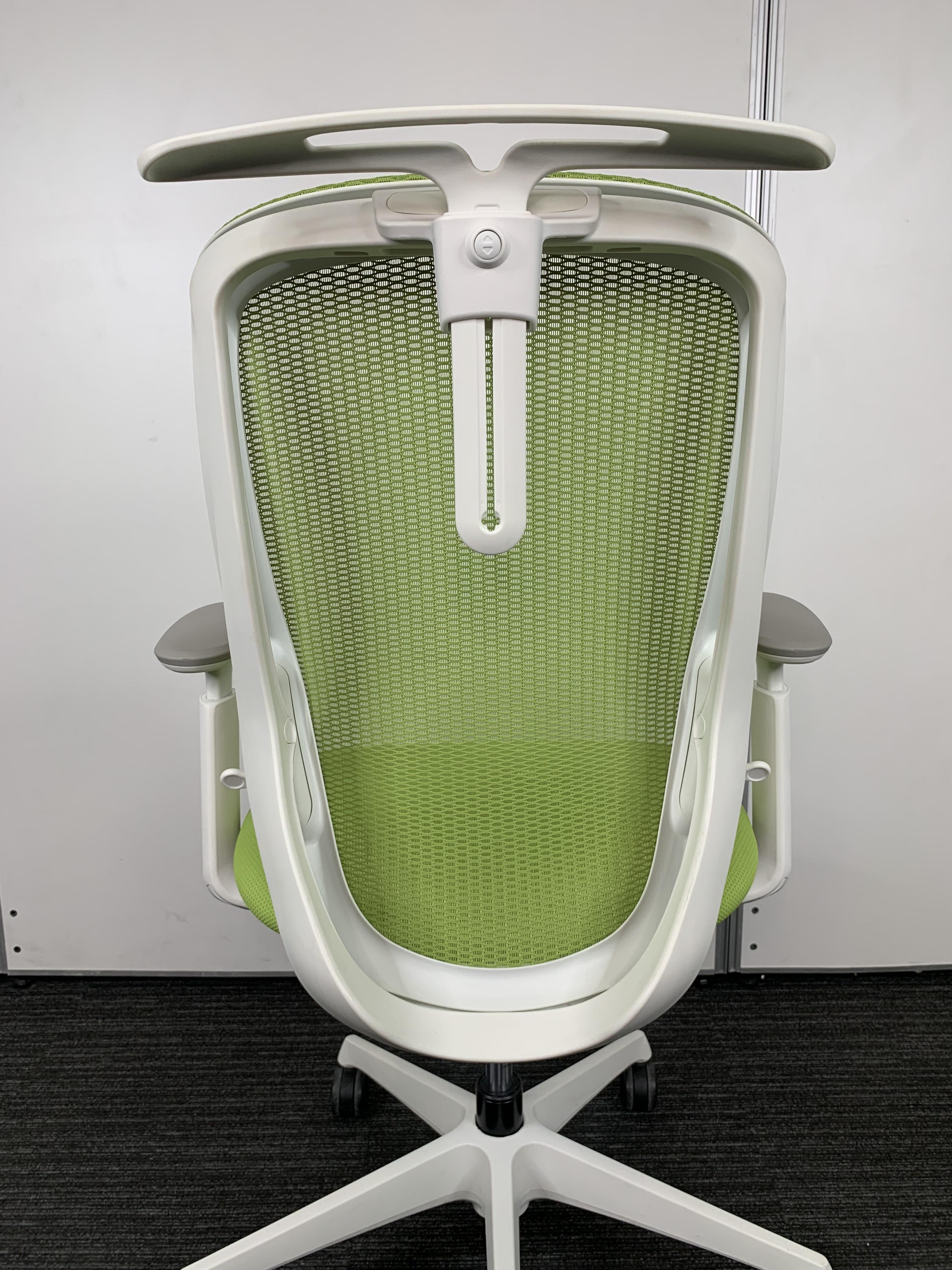 【前傾チルト機能付き!オカムラ製品で最も人気を集める高機能メッシュチェア!】■オカムラ(okamura)製 シルフィ(Sylphy)チェア ハイバック 肘付き ■可動肘 ■ヘッドレスト付き ■ライムグリーン × ホワイトシェル ※実際の商品はヘッドレスト部分のみブラックカラーとなります。