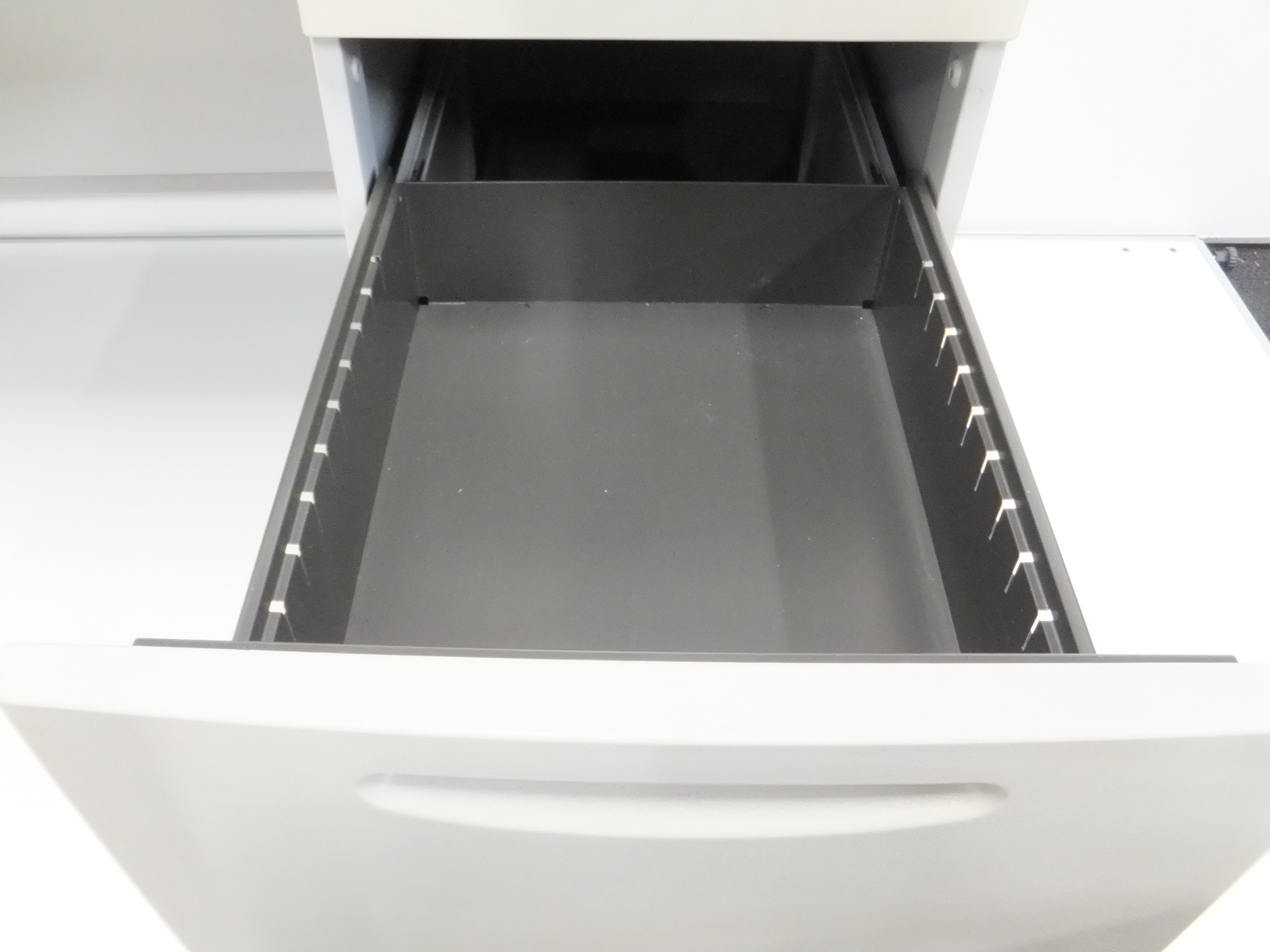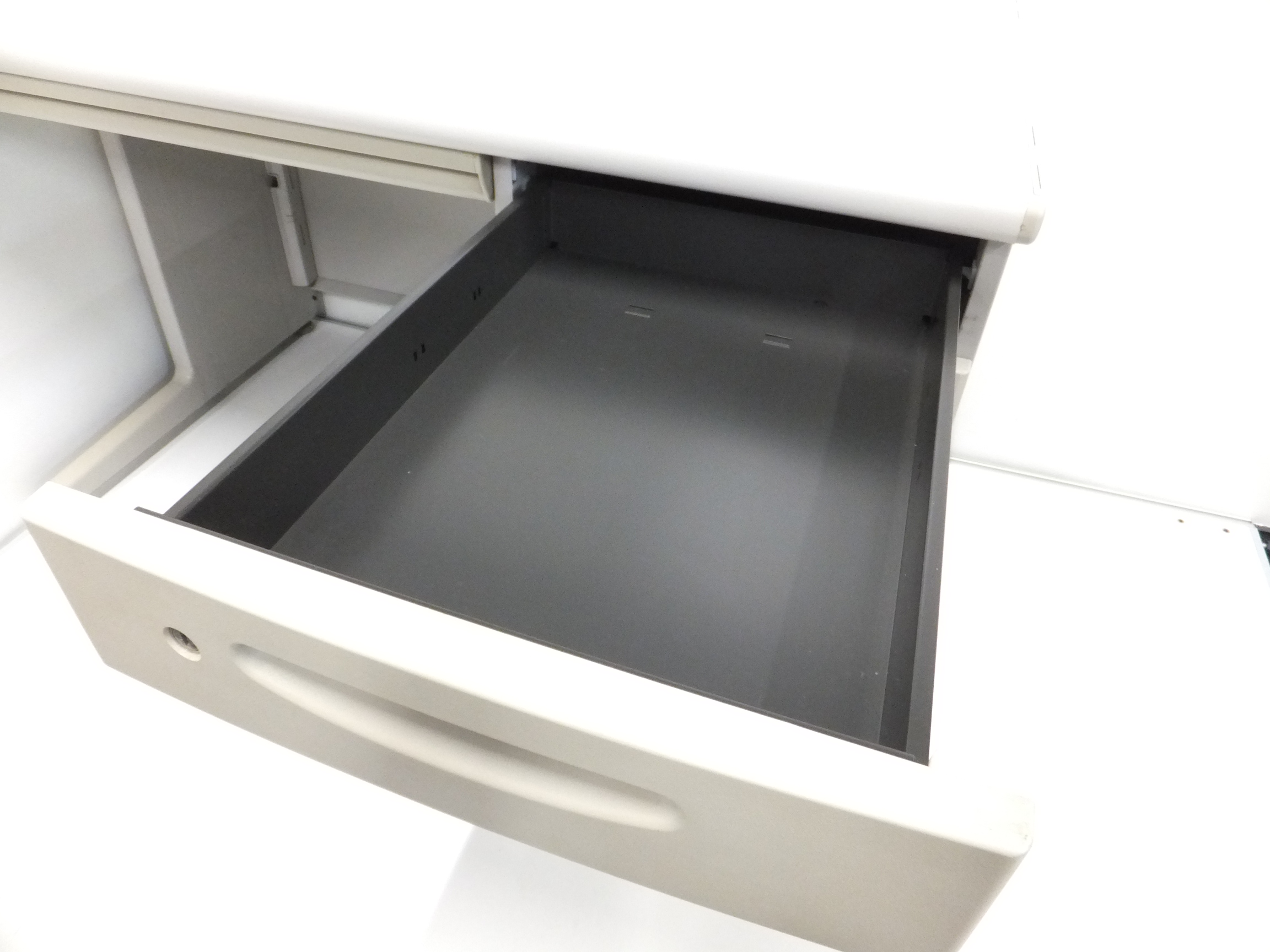 - 袖机のワゴンは、最下段がロング引出しになっており、従来より収納力120%アップ。