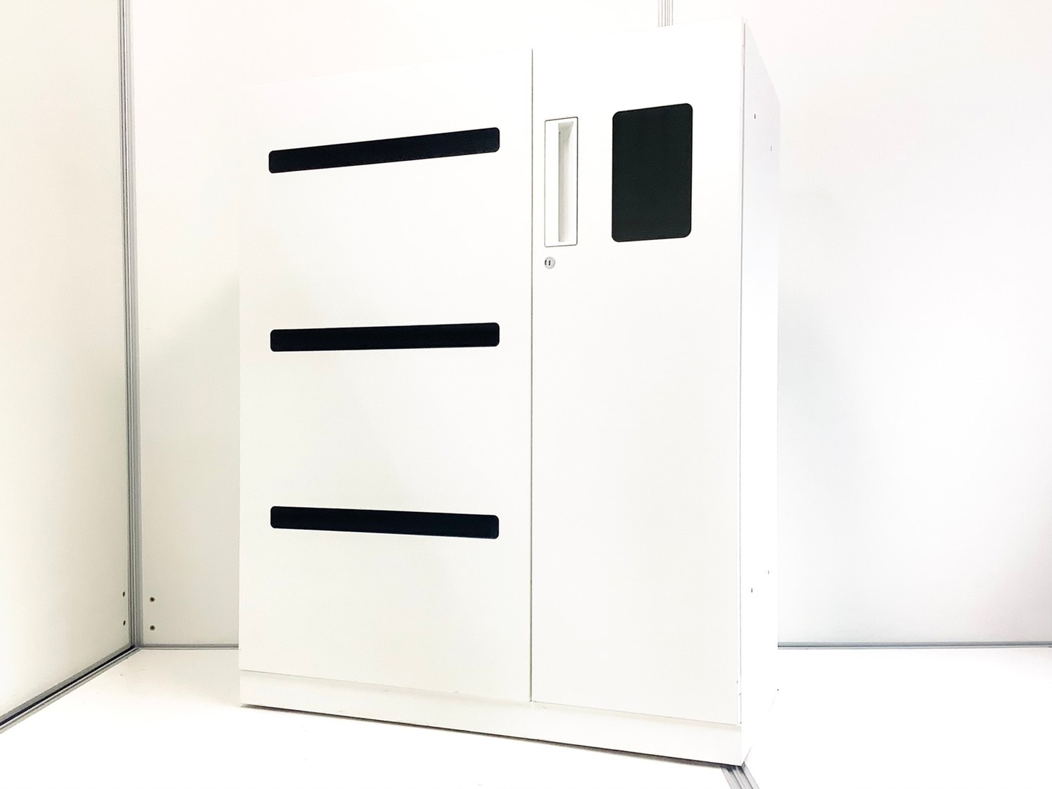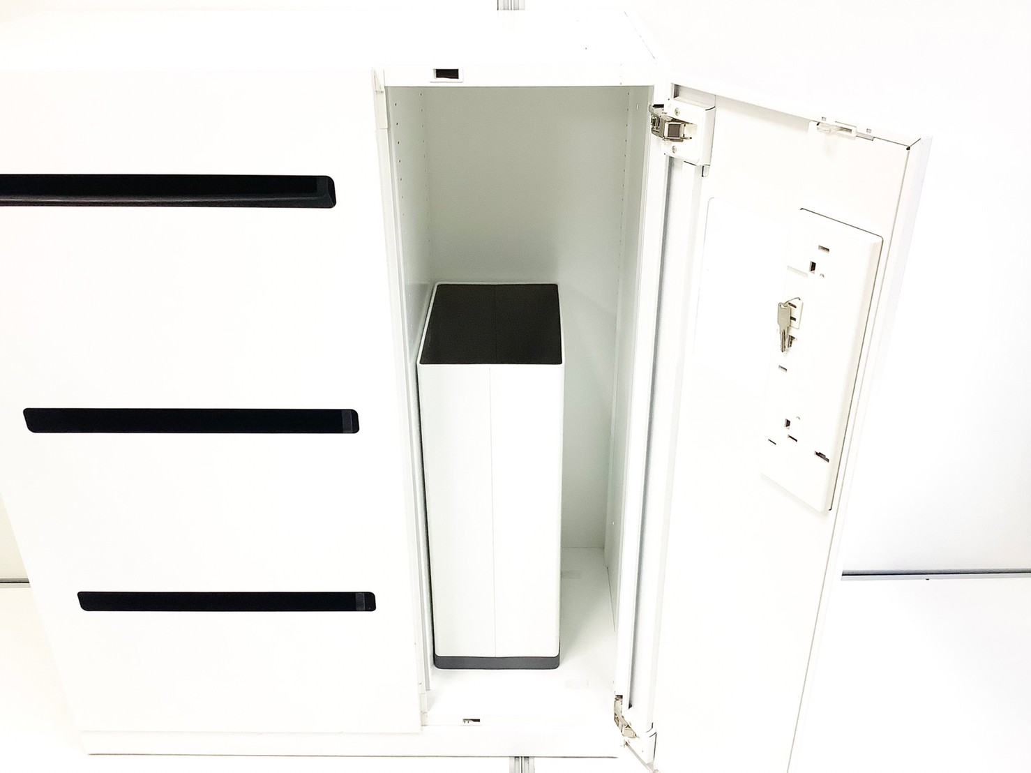 - 両開きタイプは扉が180度開き、通路の邪魔になりません。ラテラルタイプは引出しが限界まで出せ、出し入れ楽々。