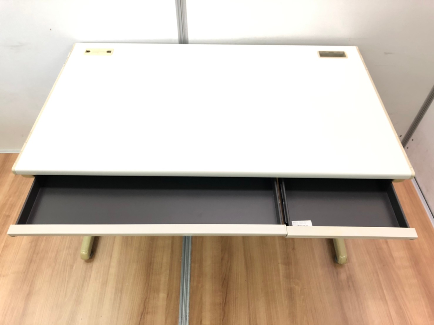 - 袖机のワゴンは、最下段がロング引出しになっており、従来より収納力120%アップ。