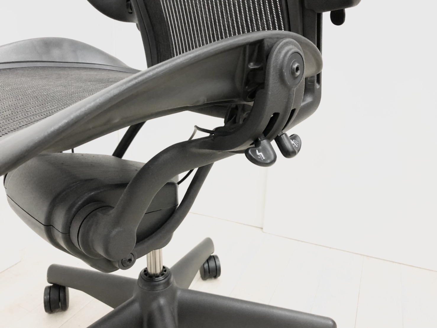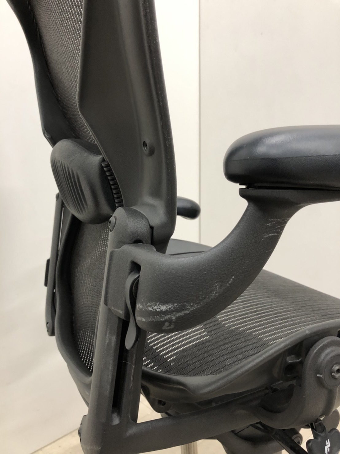 【★肘と脚にスレあり!見た目を気にしなければ使用に問題なし★】ハーマンミラー製 アーロンチェア(スタンダードタイプ) メッシュ 在宅 自宅 ゲーム 海外製 椅子 リラックス 中古家具 中古オフィス 九州最大級《オフィスバスターズ福岡博多店は、福岡を拠点として、日本全国へ中古オフィス用品・オフィス家具を提供しております》