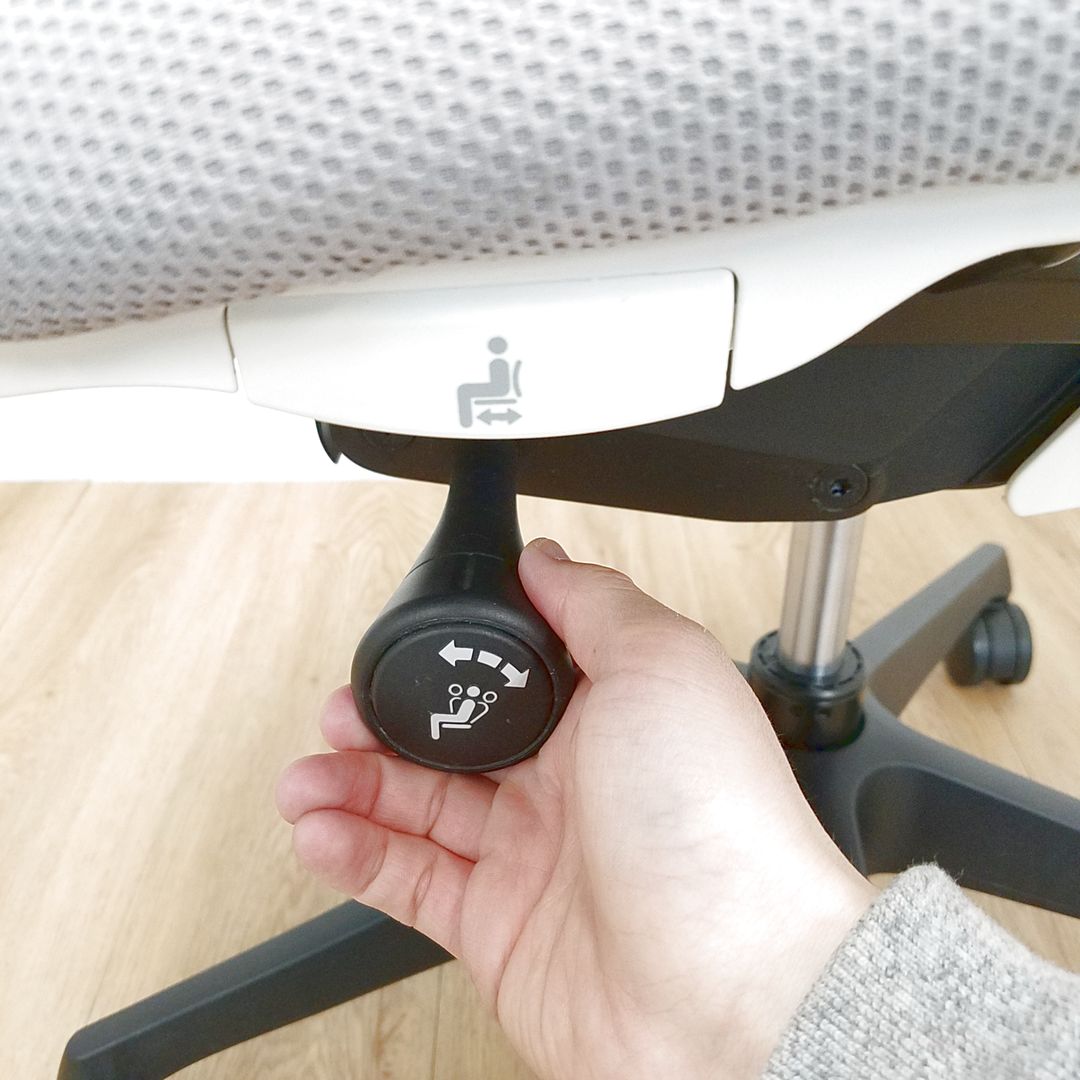 - 座面右下のダイヤル操作で、リクライニングの強弱調整が行えます。これまでのダイヤル式よりも、少ない回転数で、最弱?最強の調整が可能です。