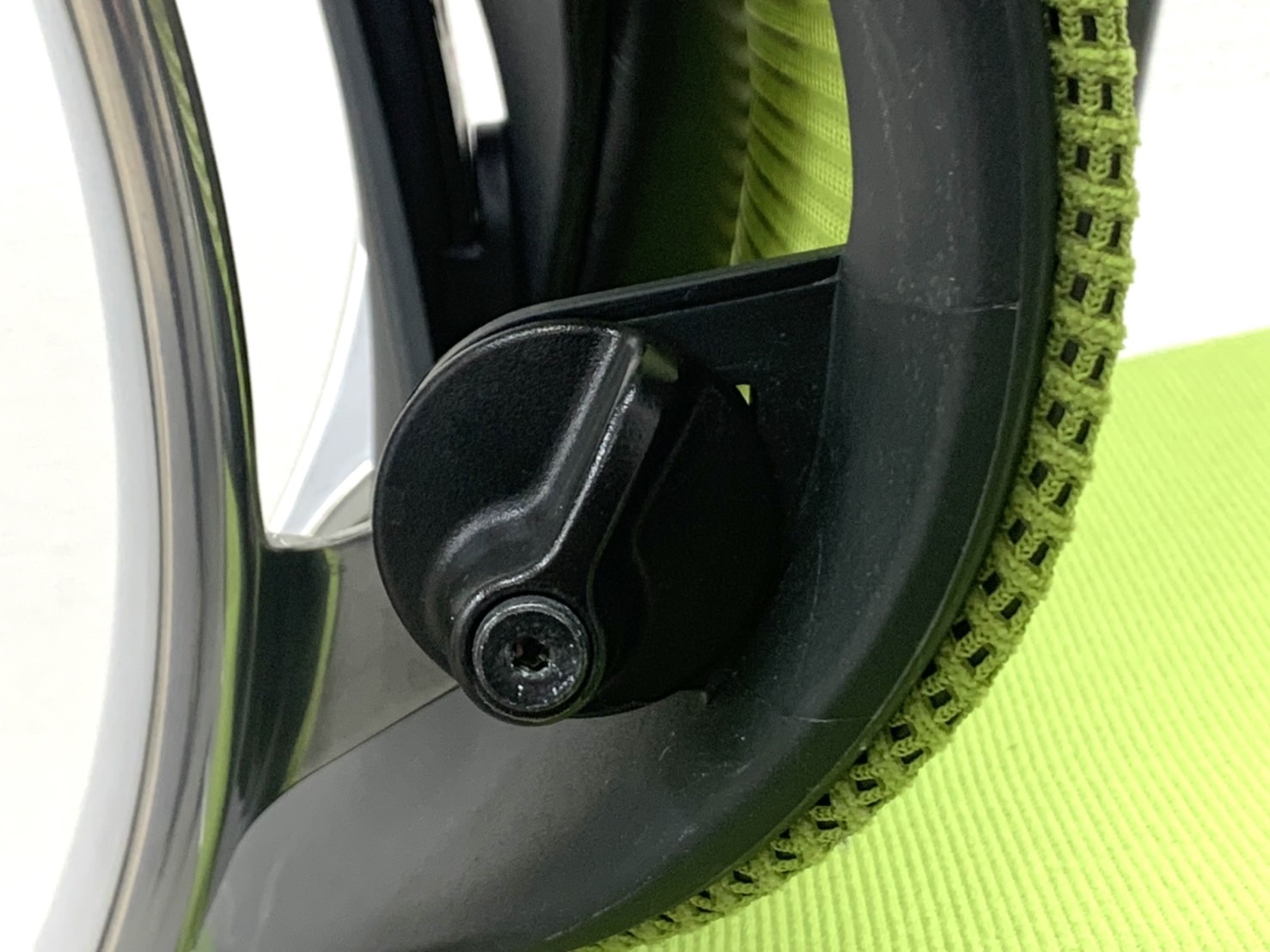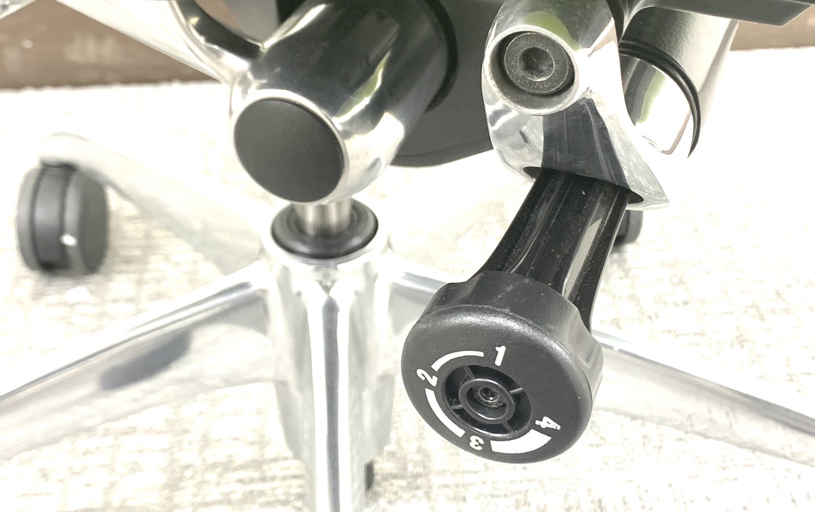 - ロッキングの強弱を調整するダイヤルがございます。体型に合わせてリクライニングの固さを座ったままで調整できます。