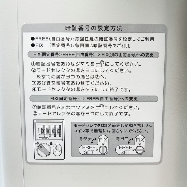 ※暗証番号が分からなくなった時の開錠用マスターキーは付属されておりません(新品時も別売が基本です)。