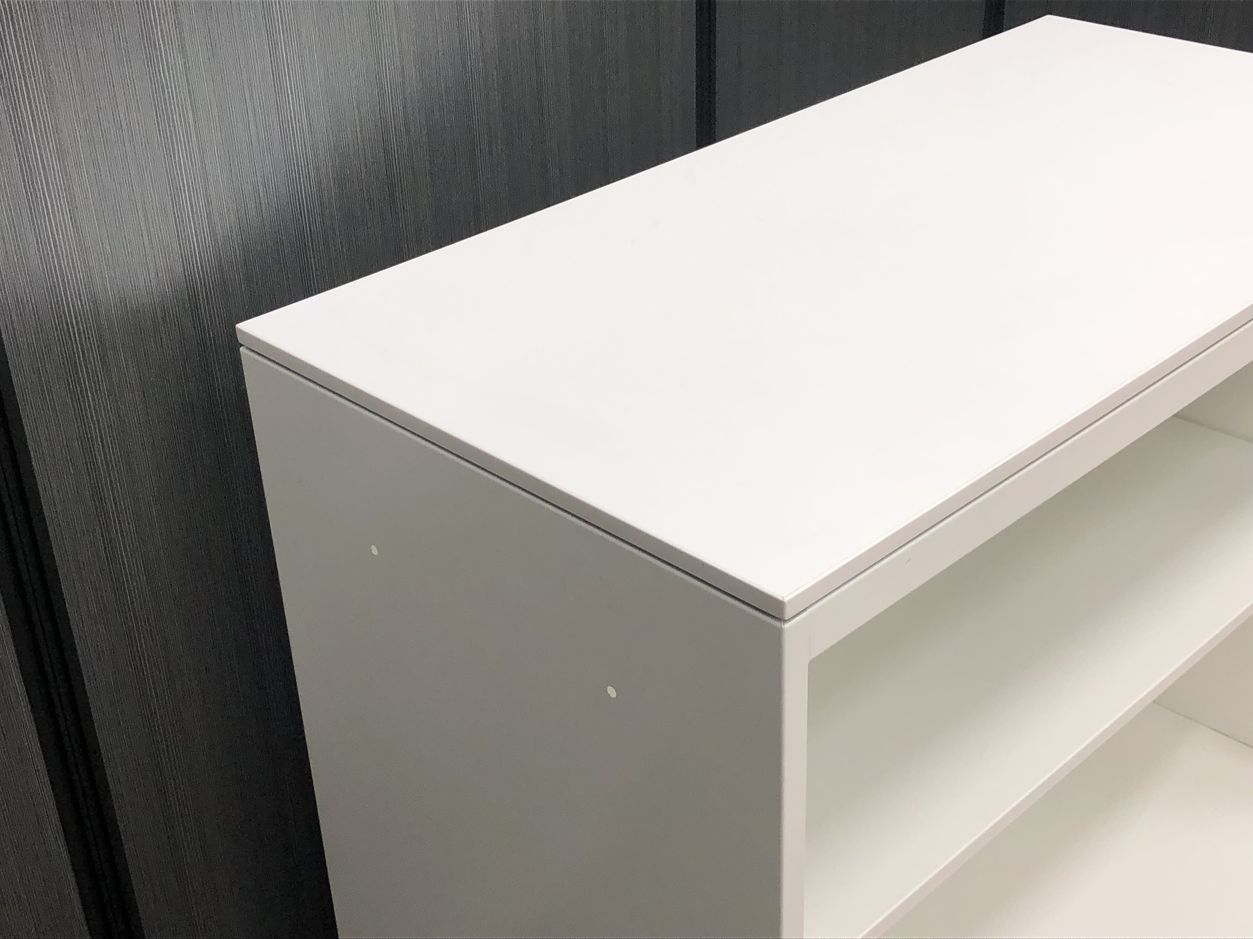 【オフィスの書類をスッキリ整理! 扉の無いタイプなので資料探しがラクラク!】■オカムラ(okamura)製 レクトライン(Rectline)シリーズ オープン書庫 ローキャビネット ■色:ホワイト ※扉外し商品のため外し跡がございます。
