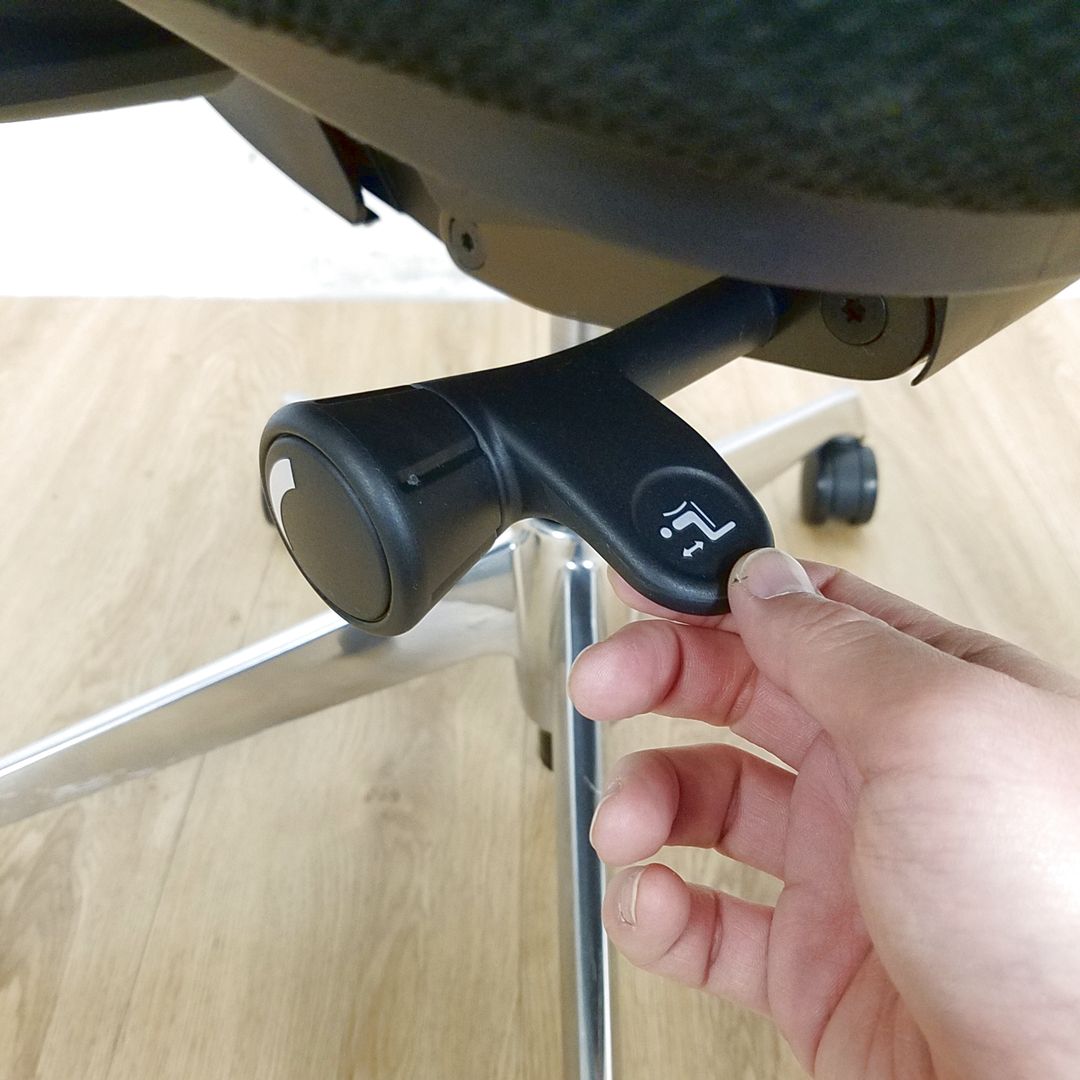 - 座面右下のダイヤル操作で、リクライニングの強弱調整が行えます。これまでのダイヤル式よりも、少ない回転数で、最弱?最強の調整が可能です。