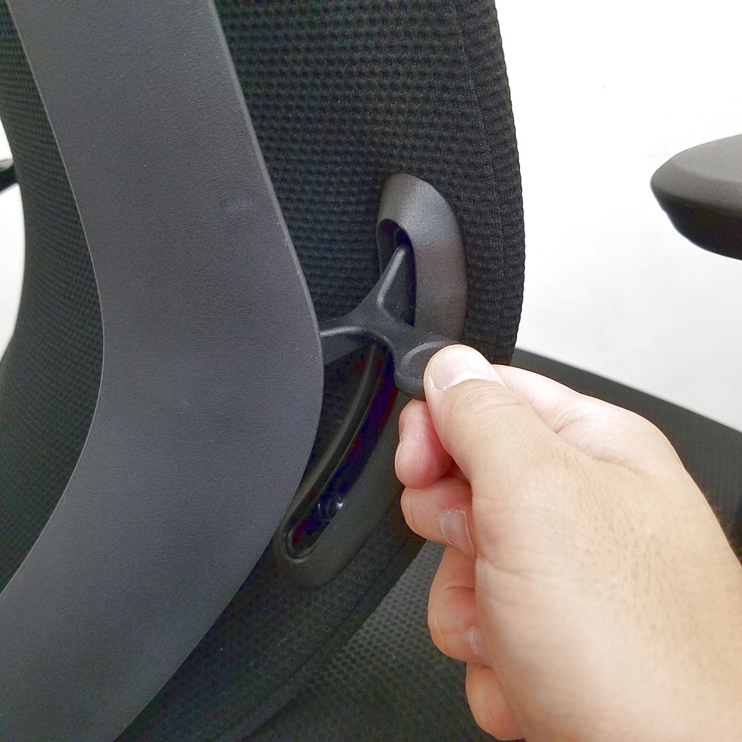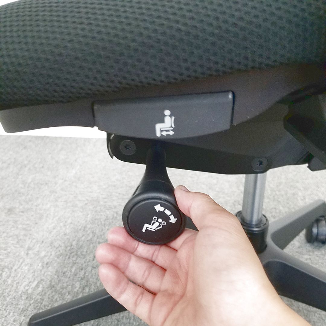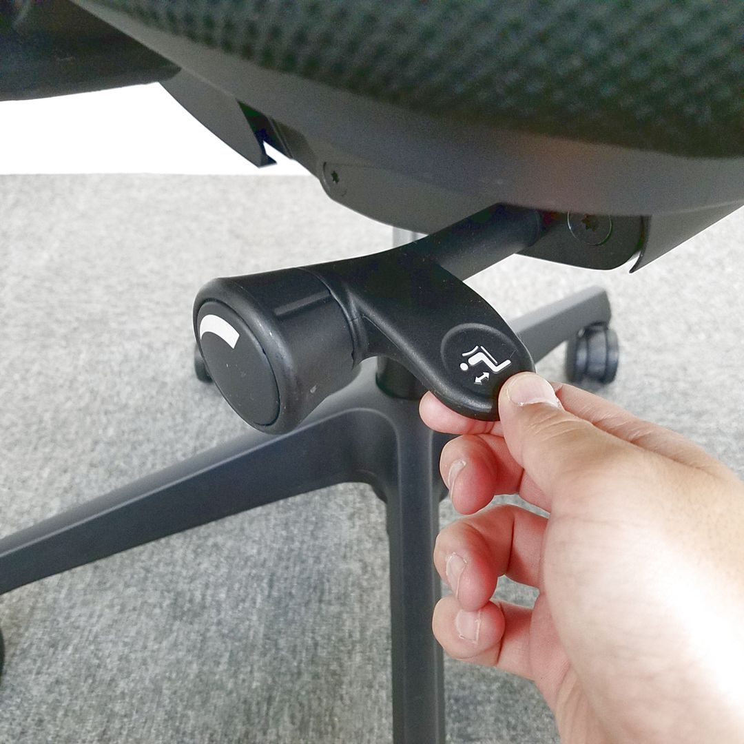- 座面右下のダイヤル操作で、リクライニングの強弱調整が行えます。これまでのダイヤル式よりも、少ない回転数で、最弱?最強の調整が可能です。