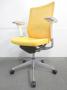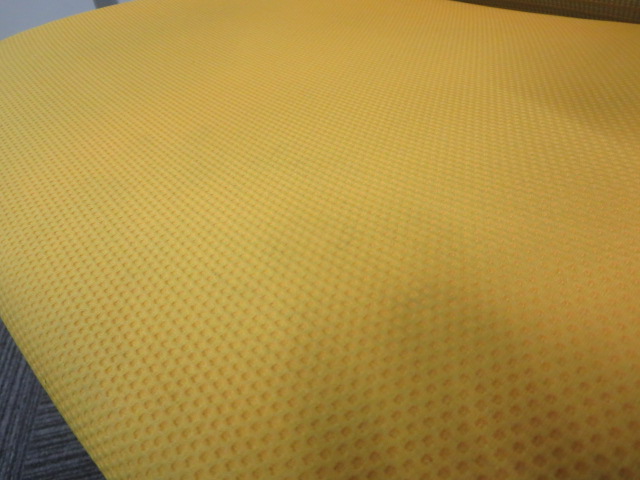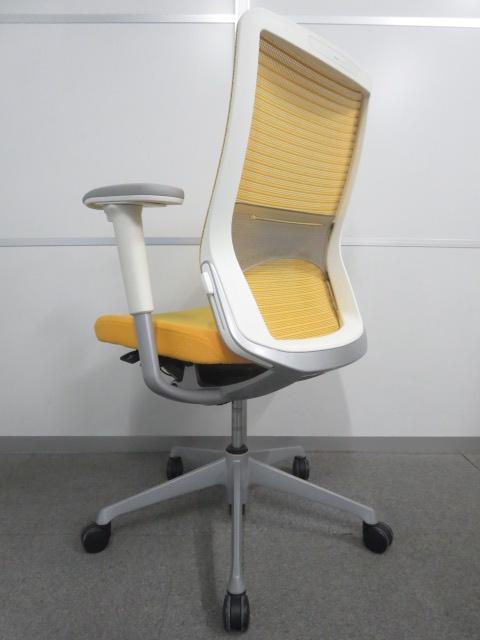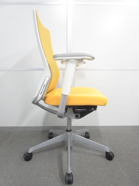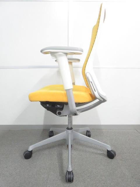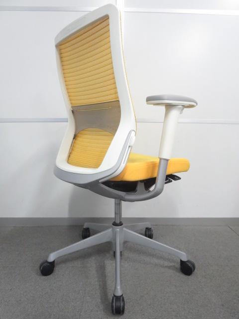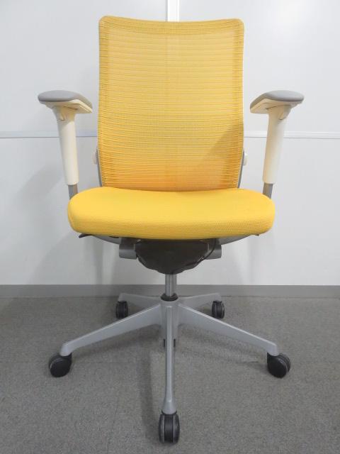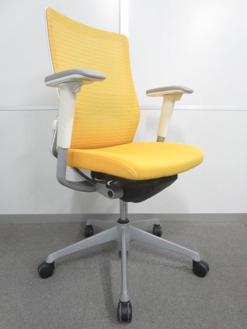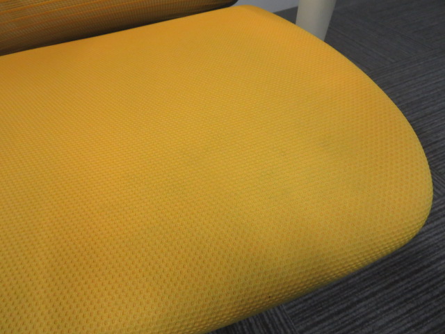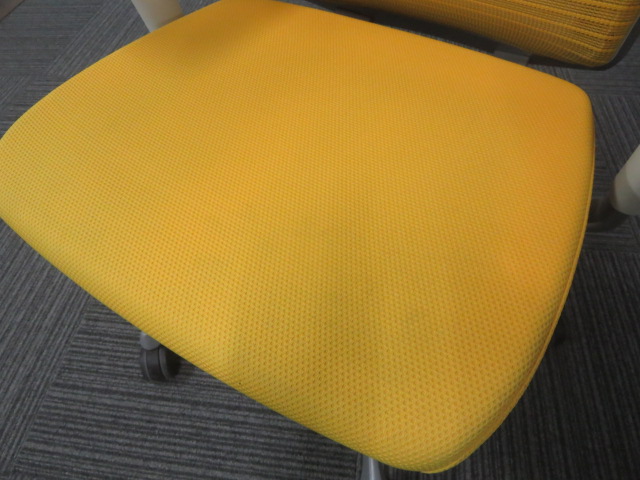 【見た目を気にしなければお買い得!】座面に薄っすら黒ズミあり。。■オカムラ製 コーラルチェア 可動肘付 マンゴーイエロー ■快適クッションで上質な座り心地!【おつとめ品】サーキュラーバリューCO2削減量の算出について