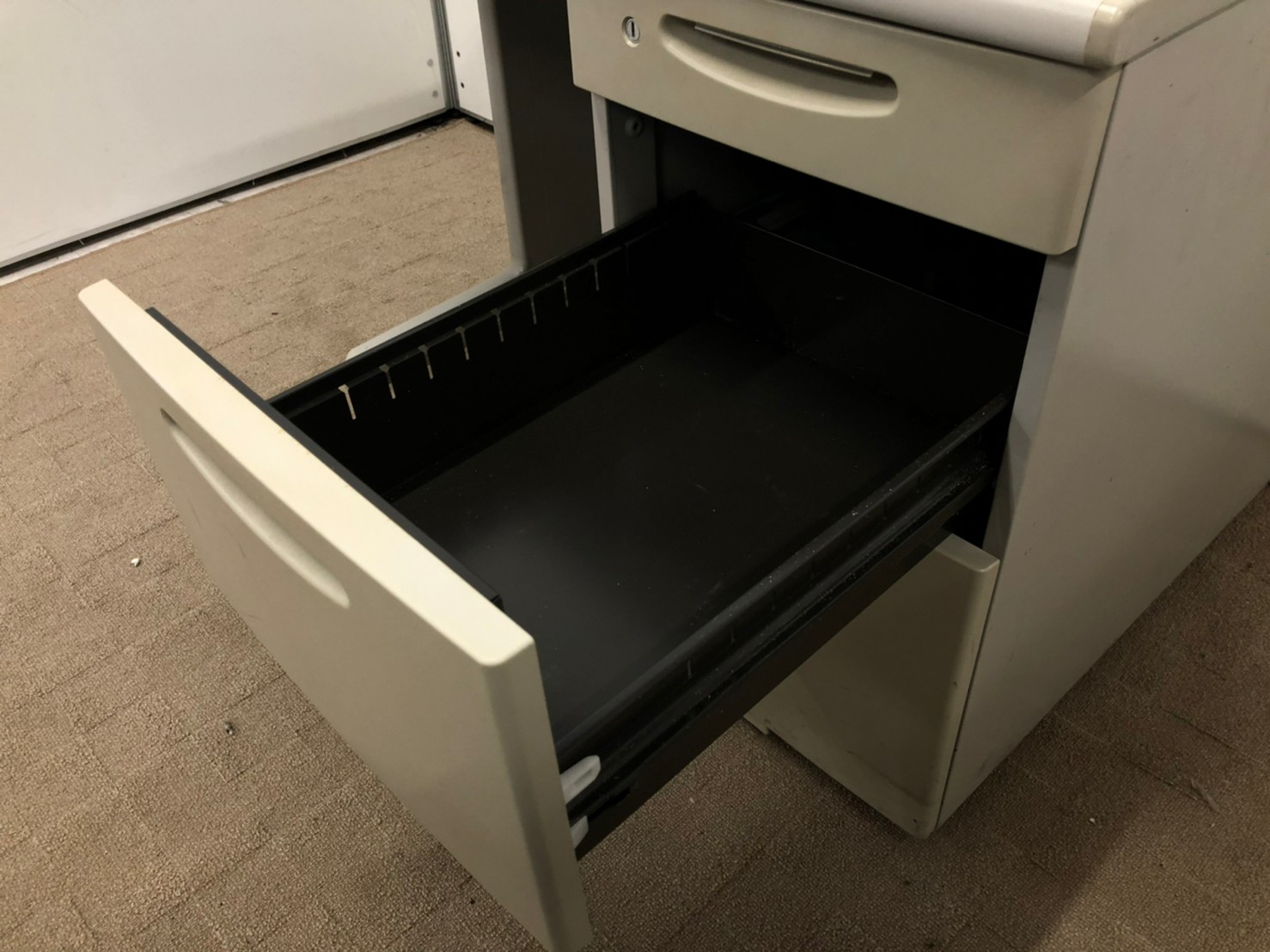- 袖机のワゴンは、最下段がロング引出しになっており、従来より収納力120%アップ。