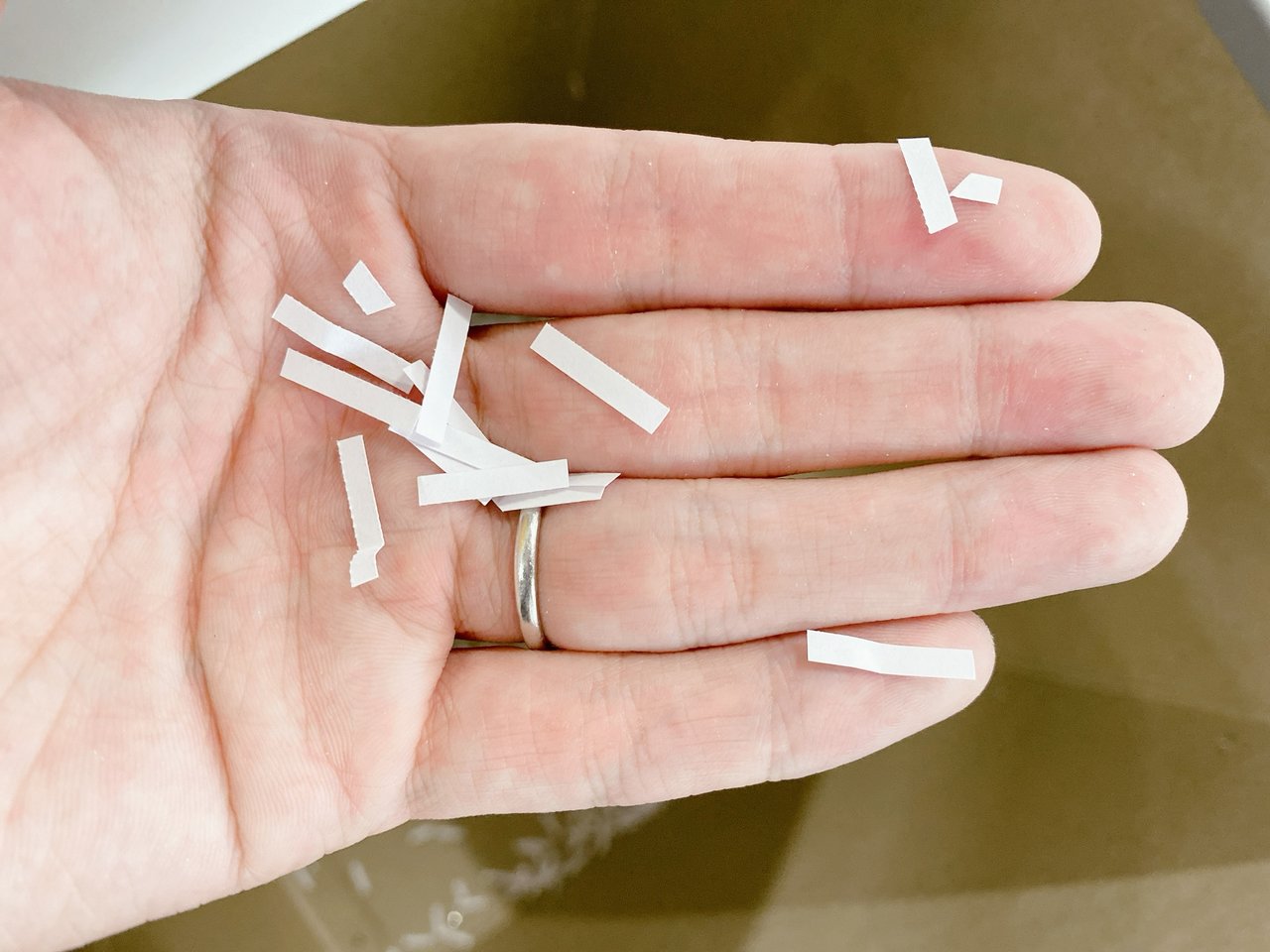 縦切りに細断後、スパイラルカッターで横切りしこれらのタイプの異なるカッターの組み合わせにより、