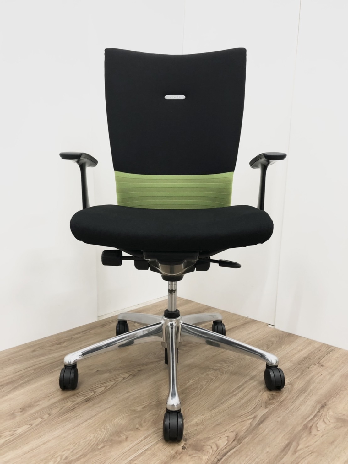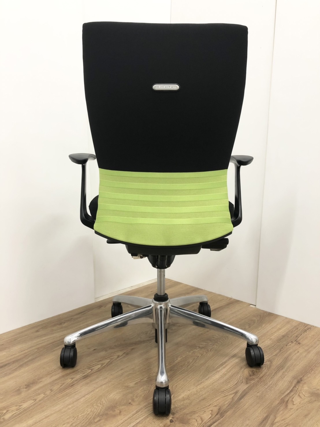 【人間工学に基づいた快適な座り心地! 背あてのしなやかな曲線が背中にフィット!】■オカムラ製 フィーゴチェア (feego) 肘付ハイバック シームレスタイプ ■肘付 ■ブラック×グリーン ■固定肘