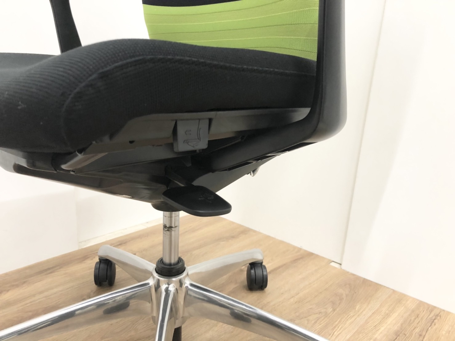 【快適な座り心地で作業効率アップ!】■オカムラ フィーゴチェア 可動肘付 シームレスタイプ ライムグリーン ハンガー付 ※肘に擦れ・削れ・欠けありのためお安く!