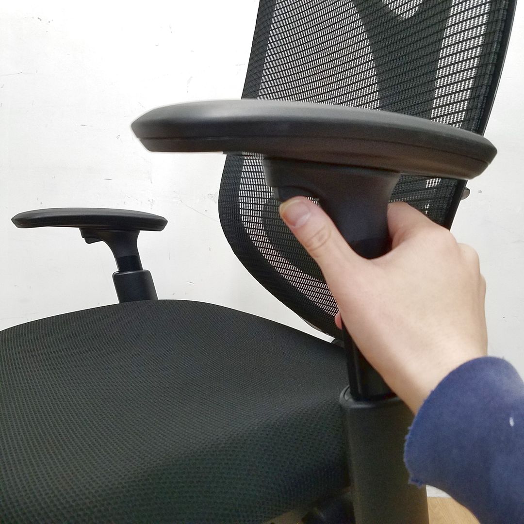 - 肘パッド部の上下(1D)、角度(2D)、前後(3D)、左右(4D)の調整が可能。可動幅は、上下100mm、内側20度、外側10度、前後40mm、左右片側25mmです。