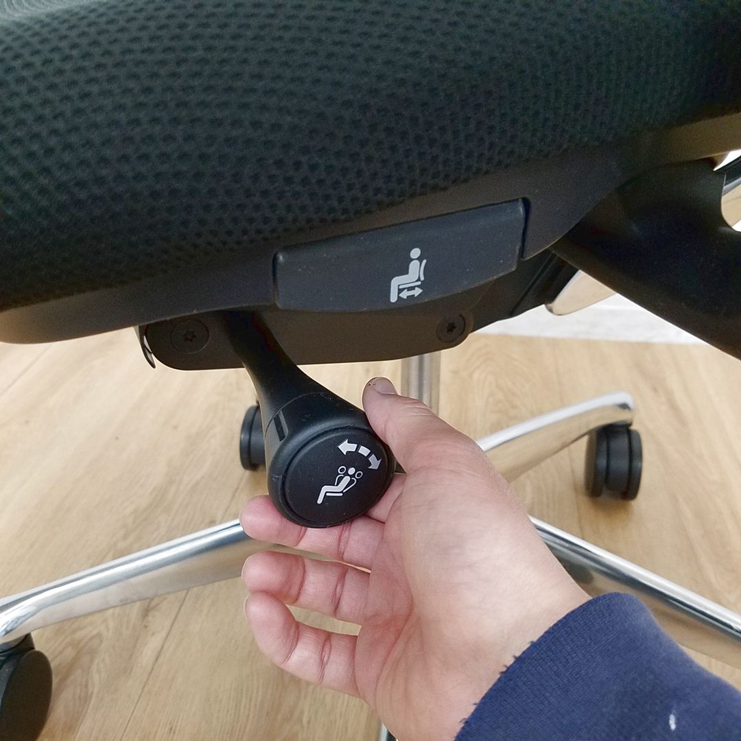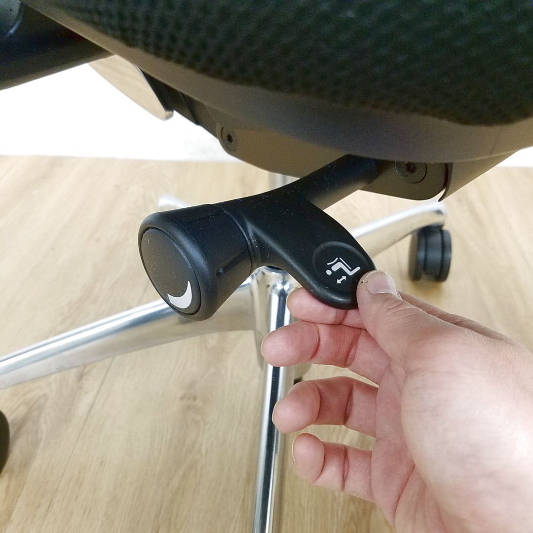 - 座面右下のレバーをスライドさせる「クイックスライドオペレーション」で、リクライニング反力を調整できます。強さの状態が視覚的にわかるため、直感的に操作がおこなえます。