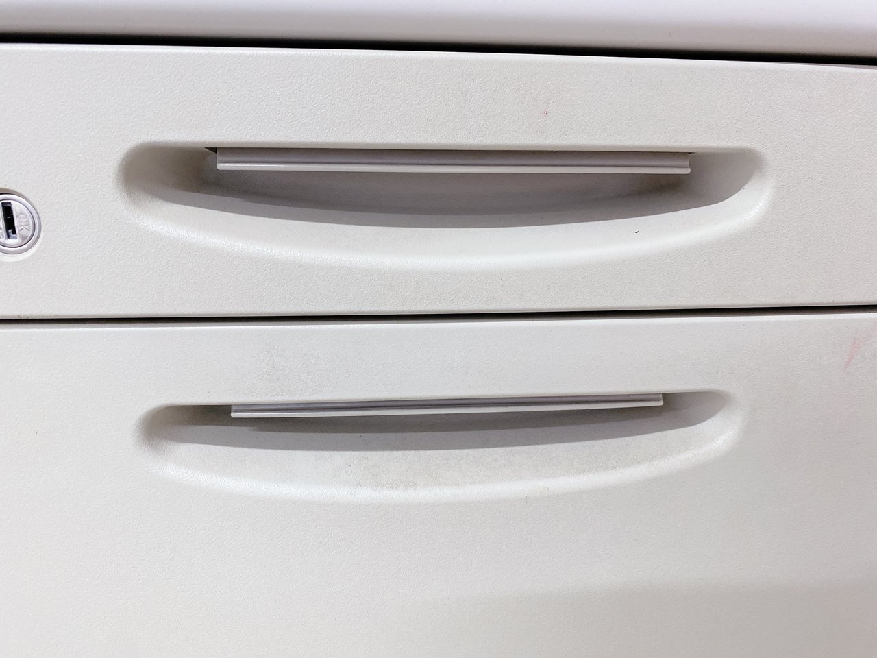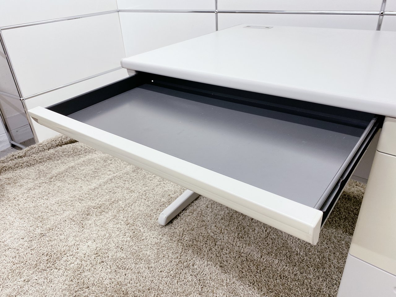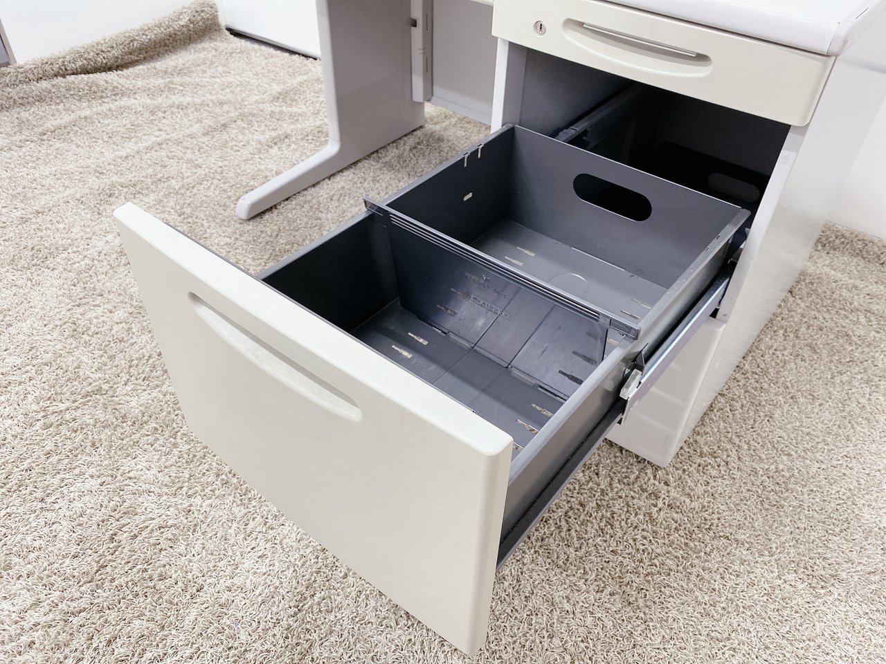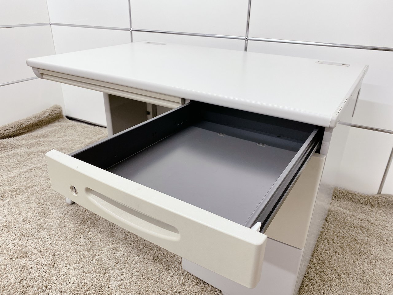 - 袖机のワゴンは、最下段がロング引出しになっており、従来より収納力120%アップ。