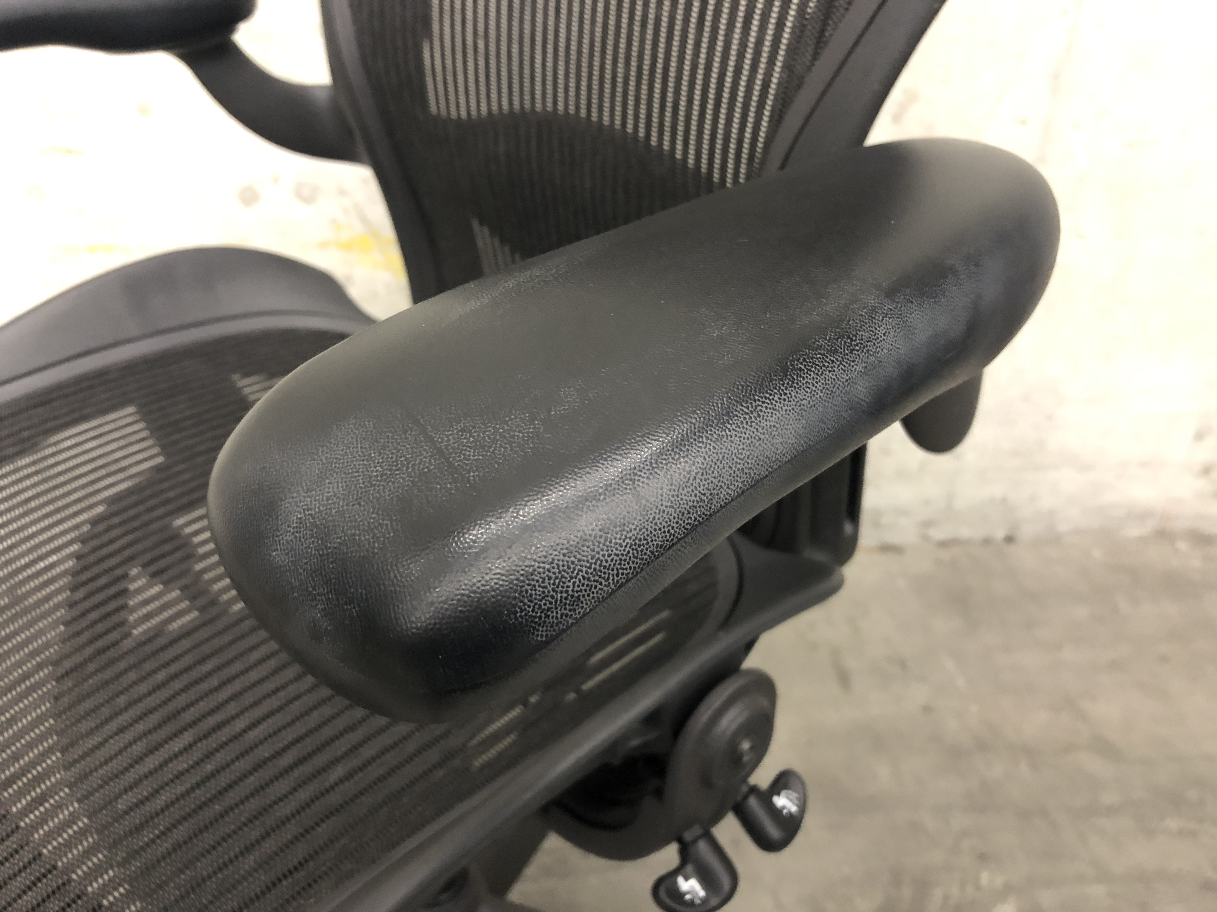 【★肘と脚にスレあり!見た目を気にしなければ使用に問題なし★】ハーマンミラー製 アーロンチェア(スタンダードタイプ) メッシュ 在宅 自宅 ゲーム 海外製 椅子 リラックス 中古家具 中古オフィス 九州最大級《オフィスバスターズ福岡博多店は、福岡を拠点として、日本全国へ中古オフィス用品・オフィス家具を提供しております》