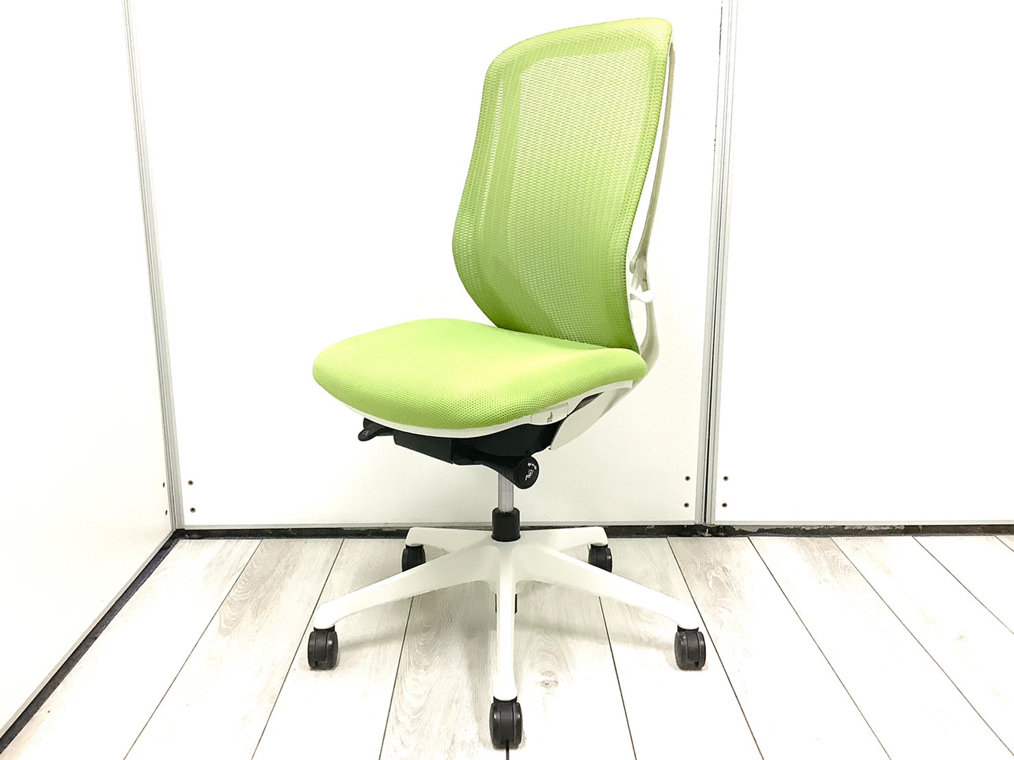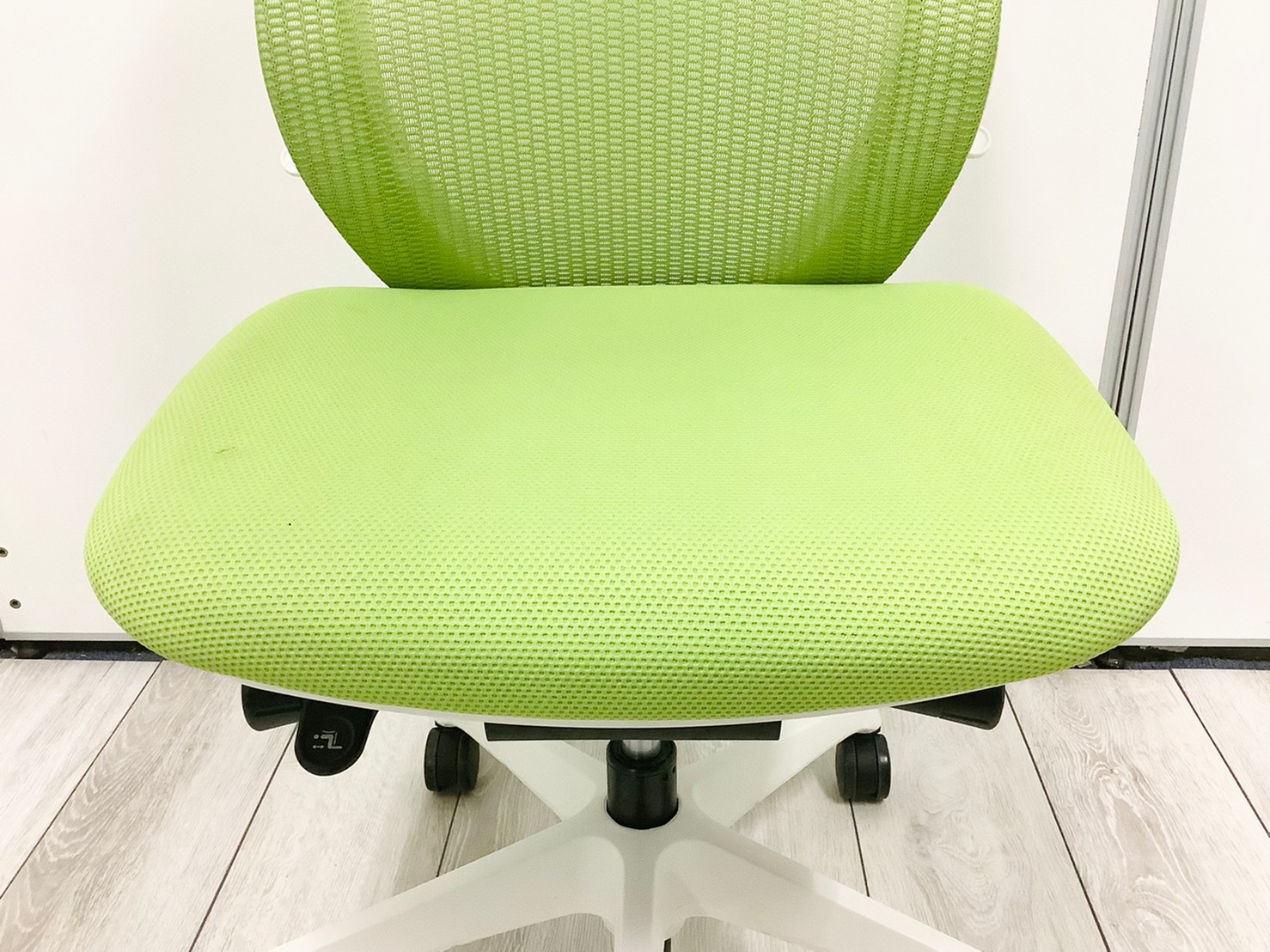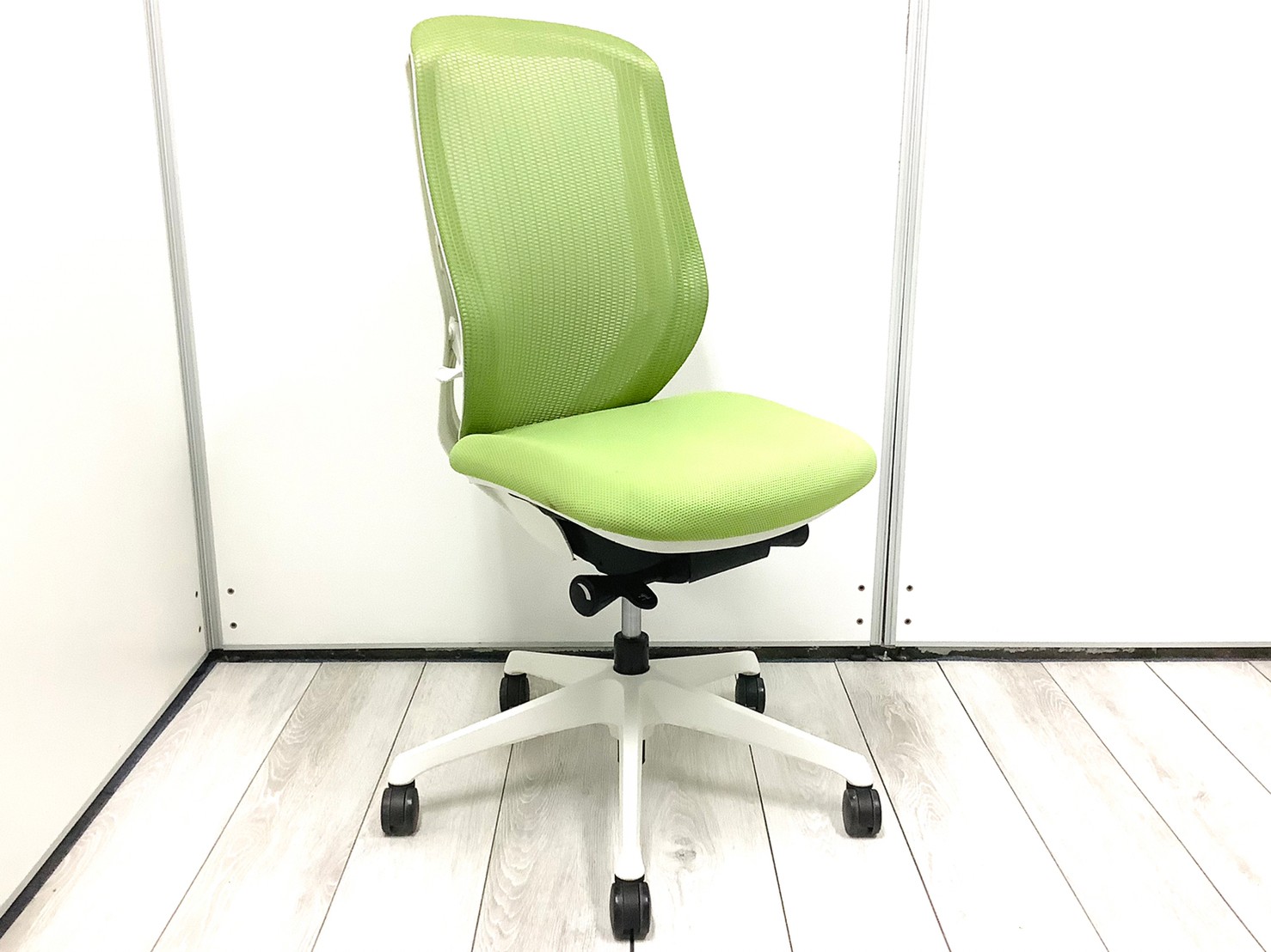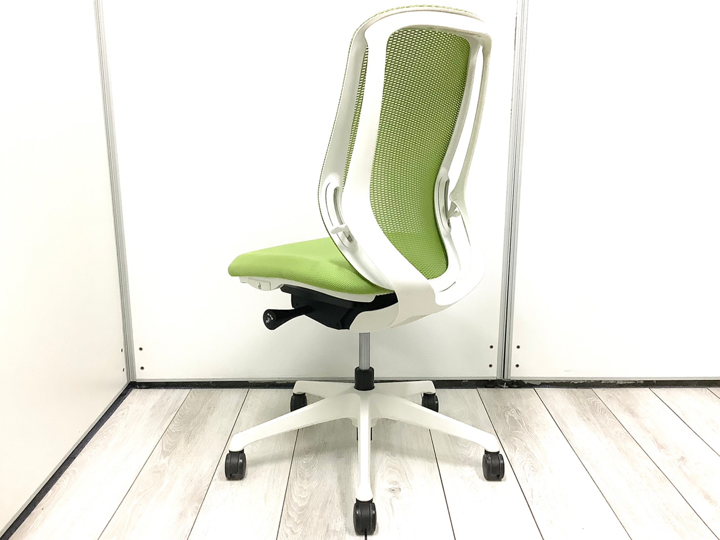 オカムラ製 シルフィーシリーズ ライムグリーン ホワイトフレーム 背面クッション コートハンガー付き 快適な座り心地を実現! 人気シリーズの背面クッションモデル! 肘無しハイバックチェア!!