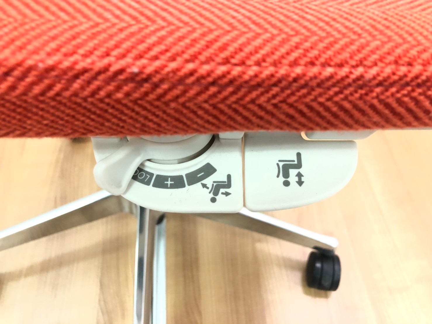 - 座面の高さ調節や背と座がシンクロしてスライドするアンクルチルトリクライニングなど、基本的な調節機能を搭載。