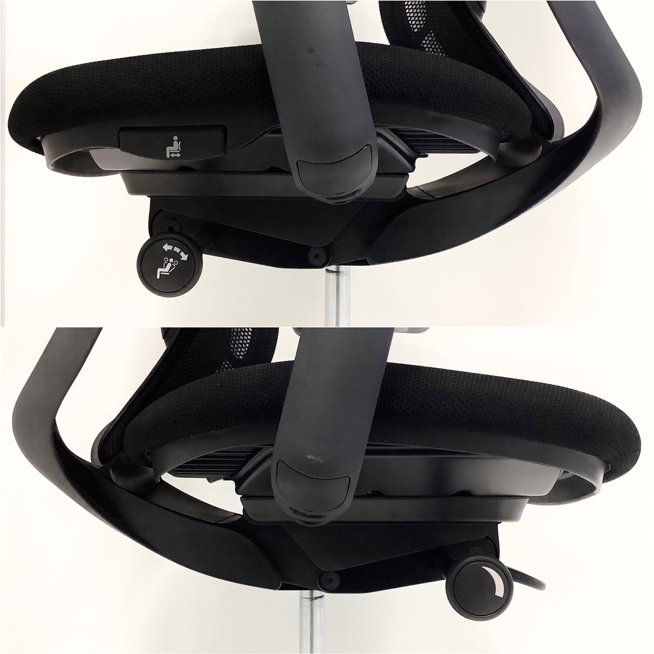 - 座面の左にあるレバー操作により、座面の奥行き調整が可能です。(ストローク:50mm)