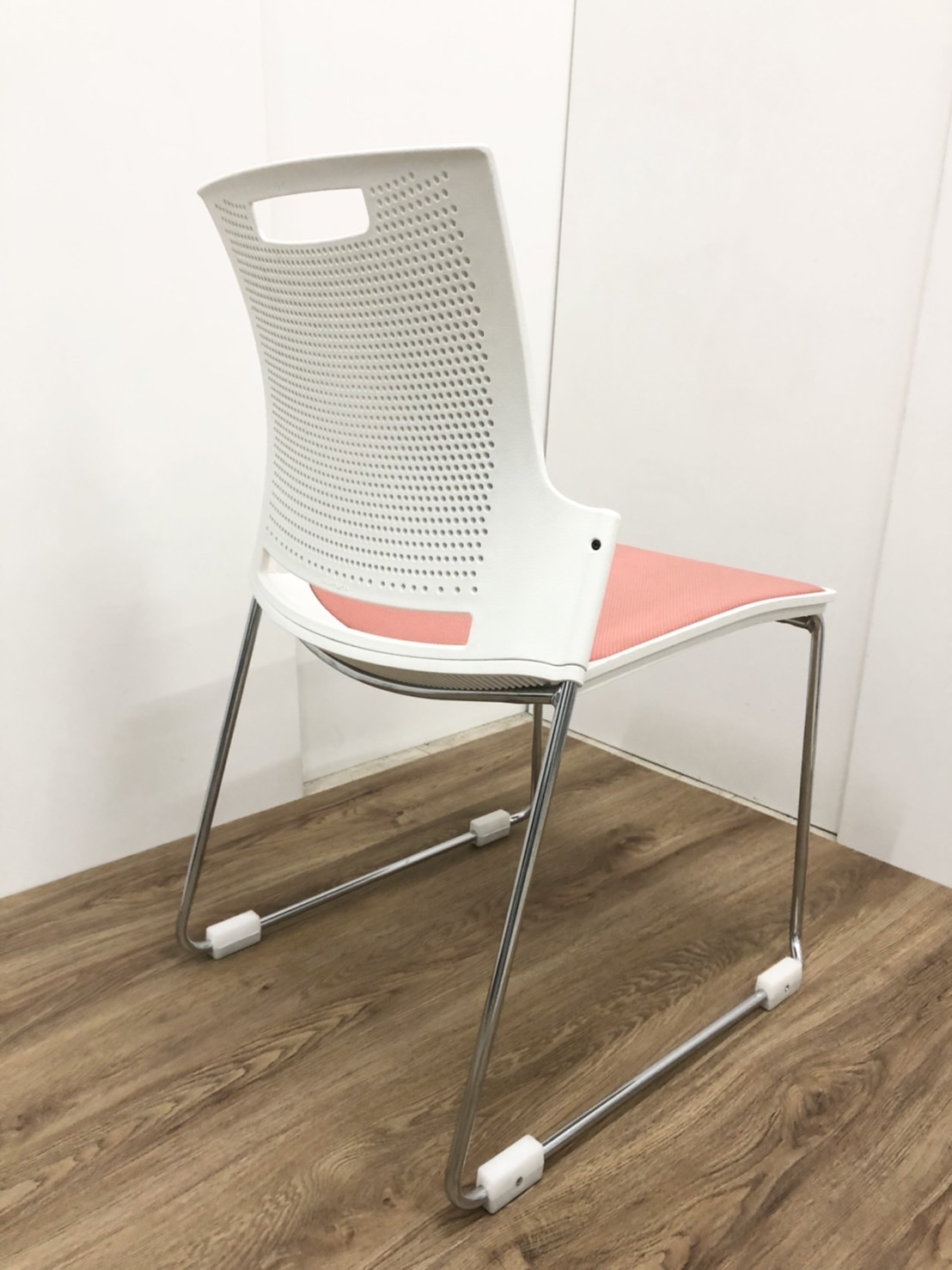 ピンクの座面と白フレームと可愛らしい見た目のスタッキングチェアです!