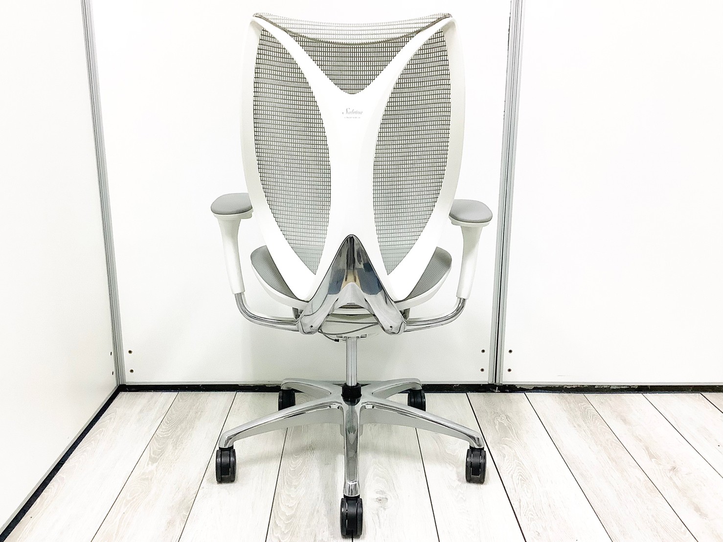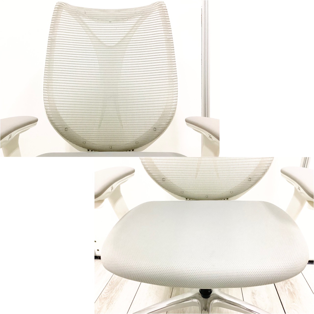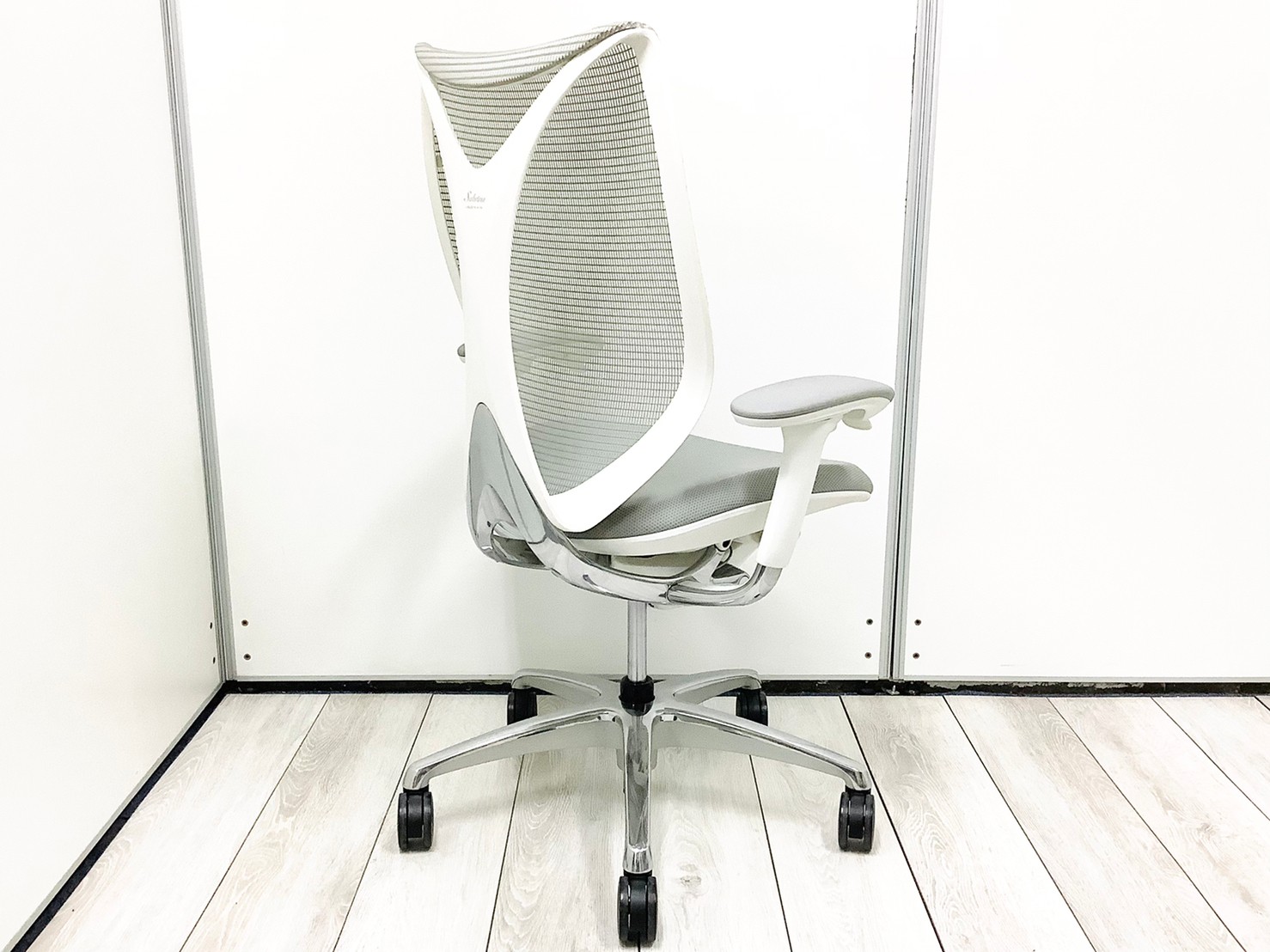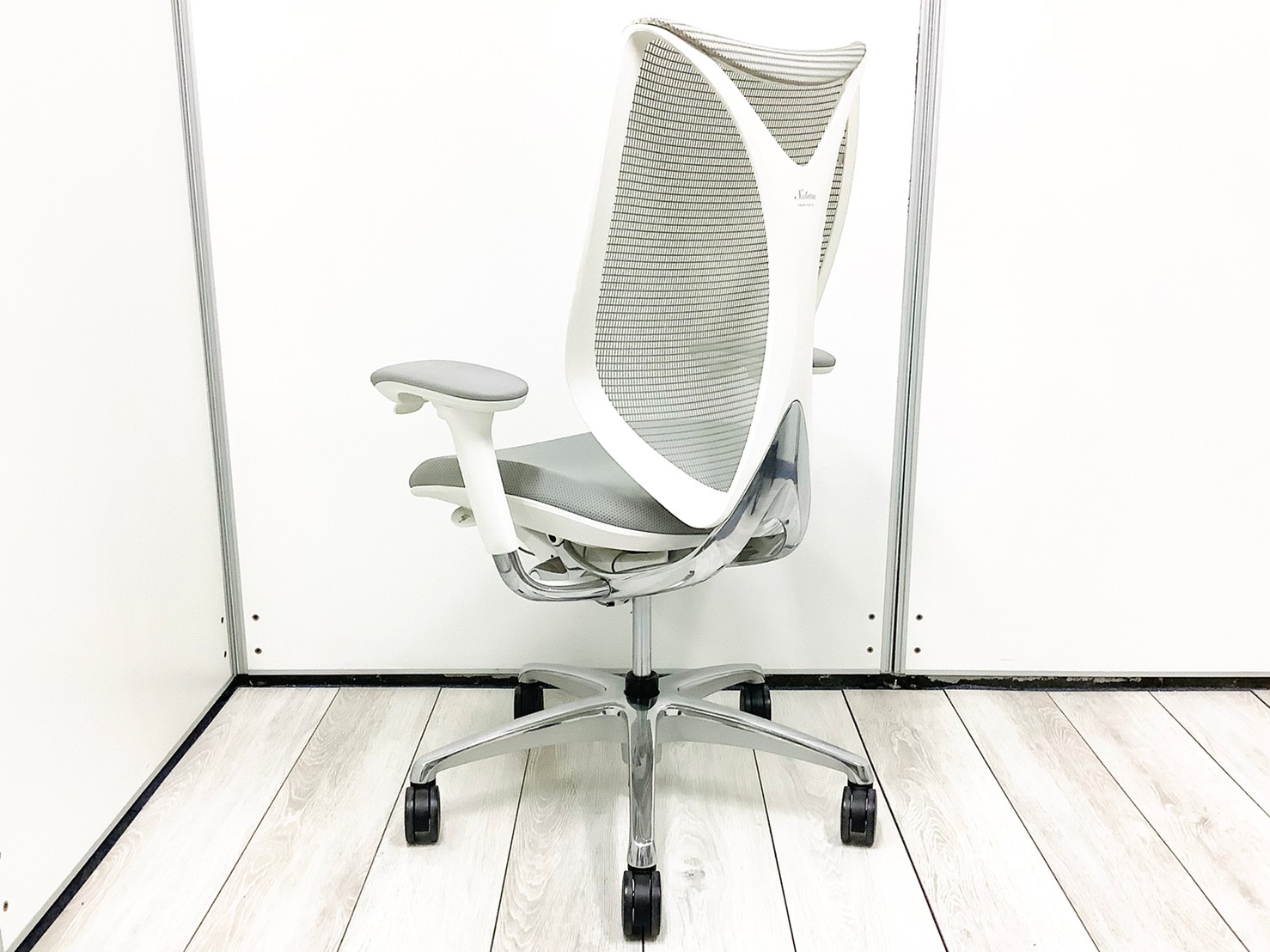 【前傾チルト付!流れるような美しいフォルムの最高級メッシュチェア!】■オカムラ(okamura)製 Sabrina(サブリナ)チェア 肘付ハイバック ■アジャストアーム(可動肘) ■背面メッシュ ■ライトグレー × ホワイトフレーム