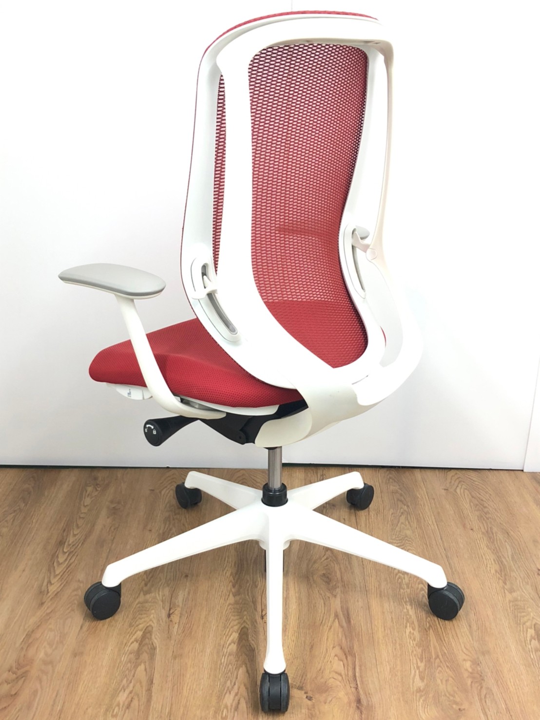 【大手町・神田サテライトCP】【三次元曲面が快適にフィット!!前傾チルト機能付の大人気メッシュチェア!】■オカムラ(okamura)製 シルフィー(Sylphy) 肘付き ハイバック ■メッシュバック ■可動肘 レッド/ フレーム色:ホワイト