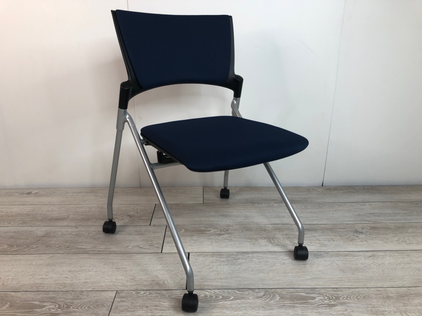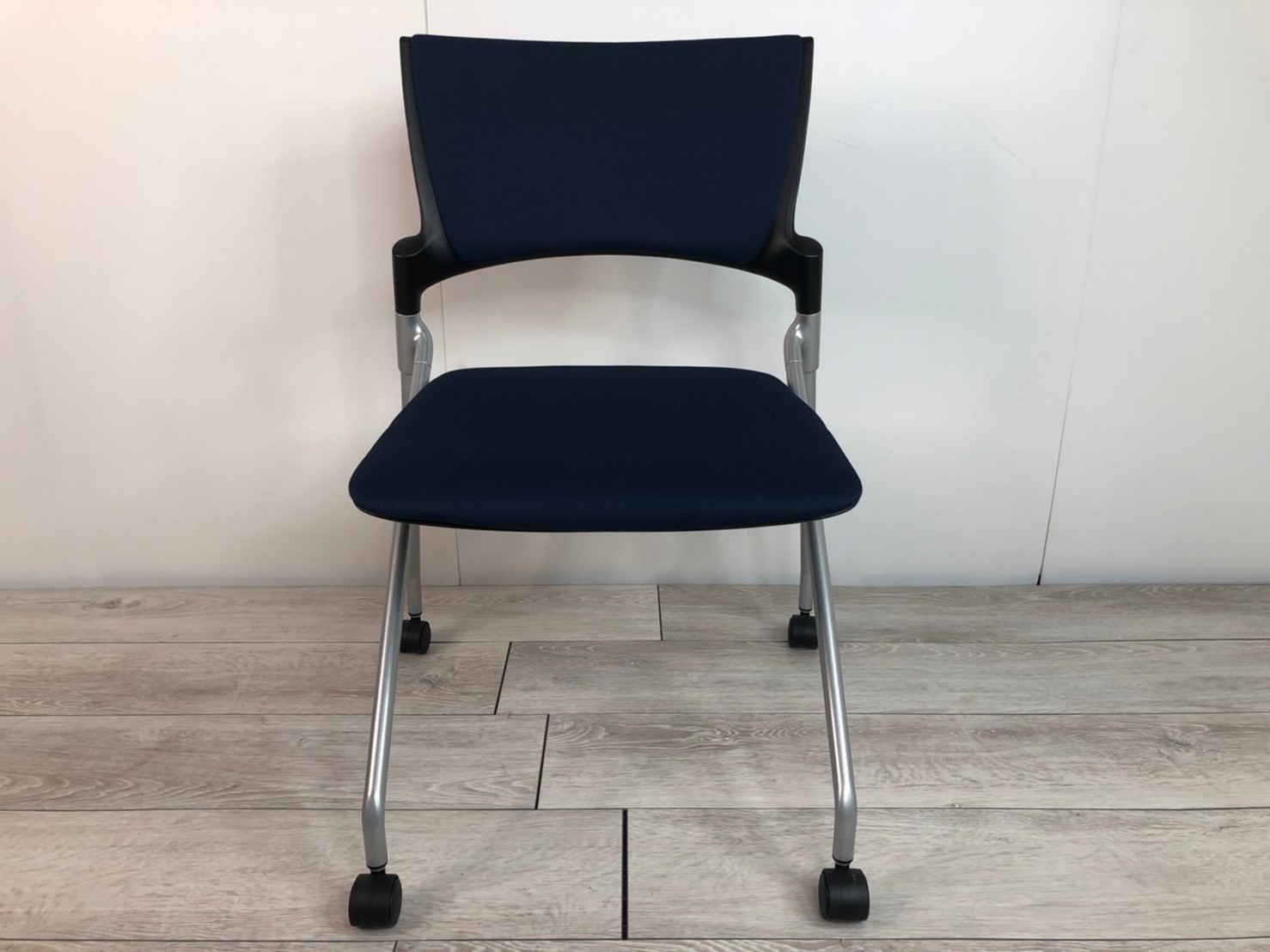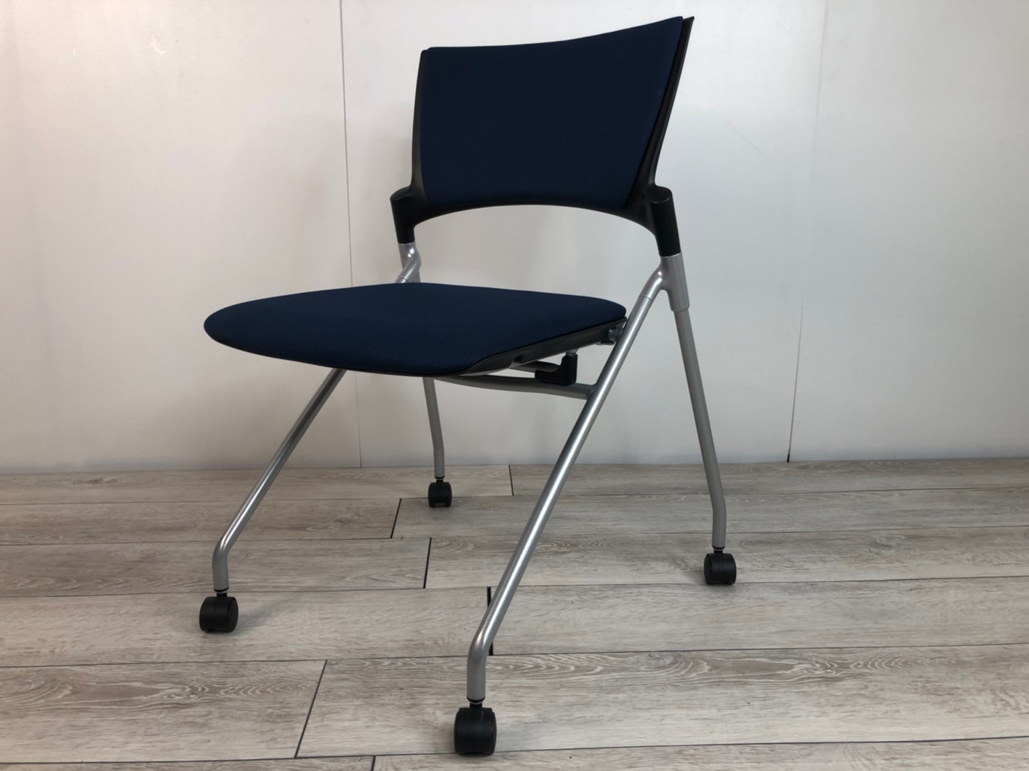 【セミナーや会議用にオススメ!平行ネスティングで省スペース化!】■イトーキ製 マノス ネスティングチェア ■背パッド付 キャスター付き ■ネイビーブルー オフィスバスターズ心斎橋店 ロット在庫
