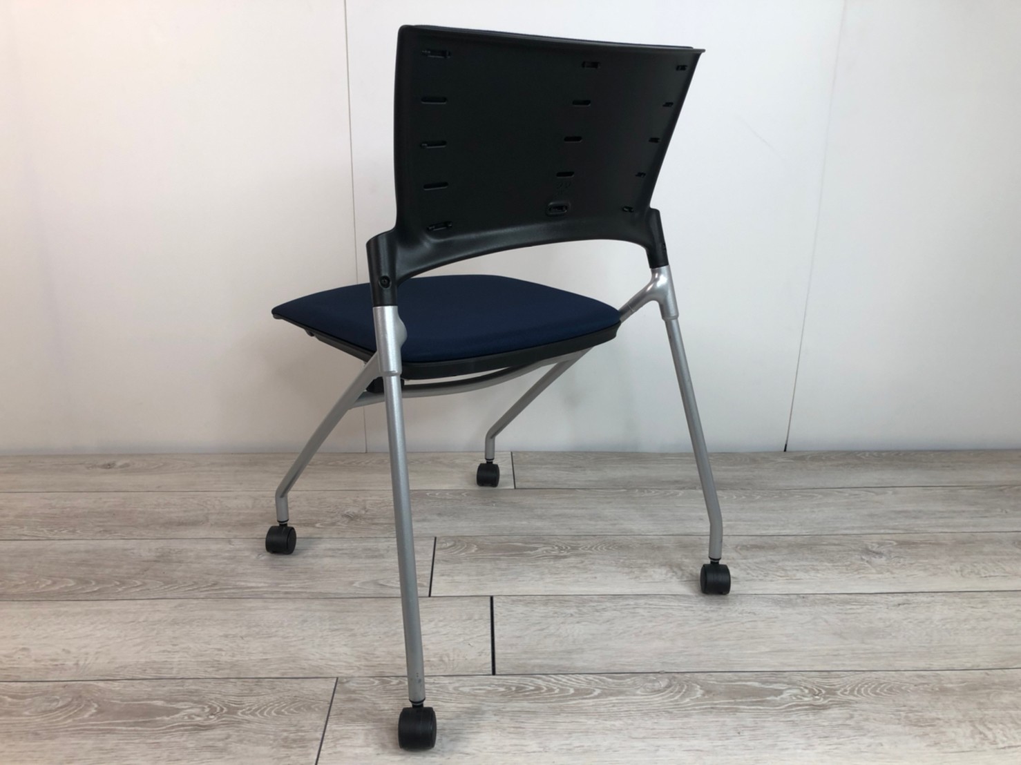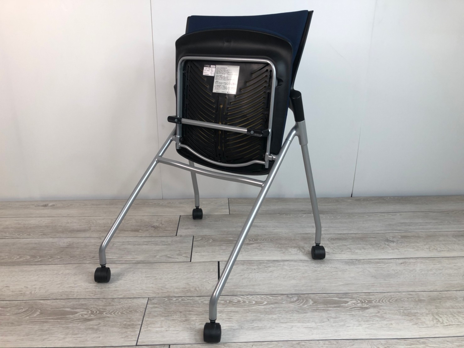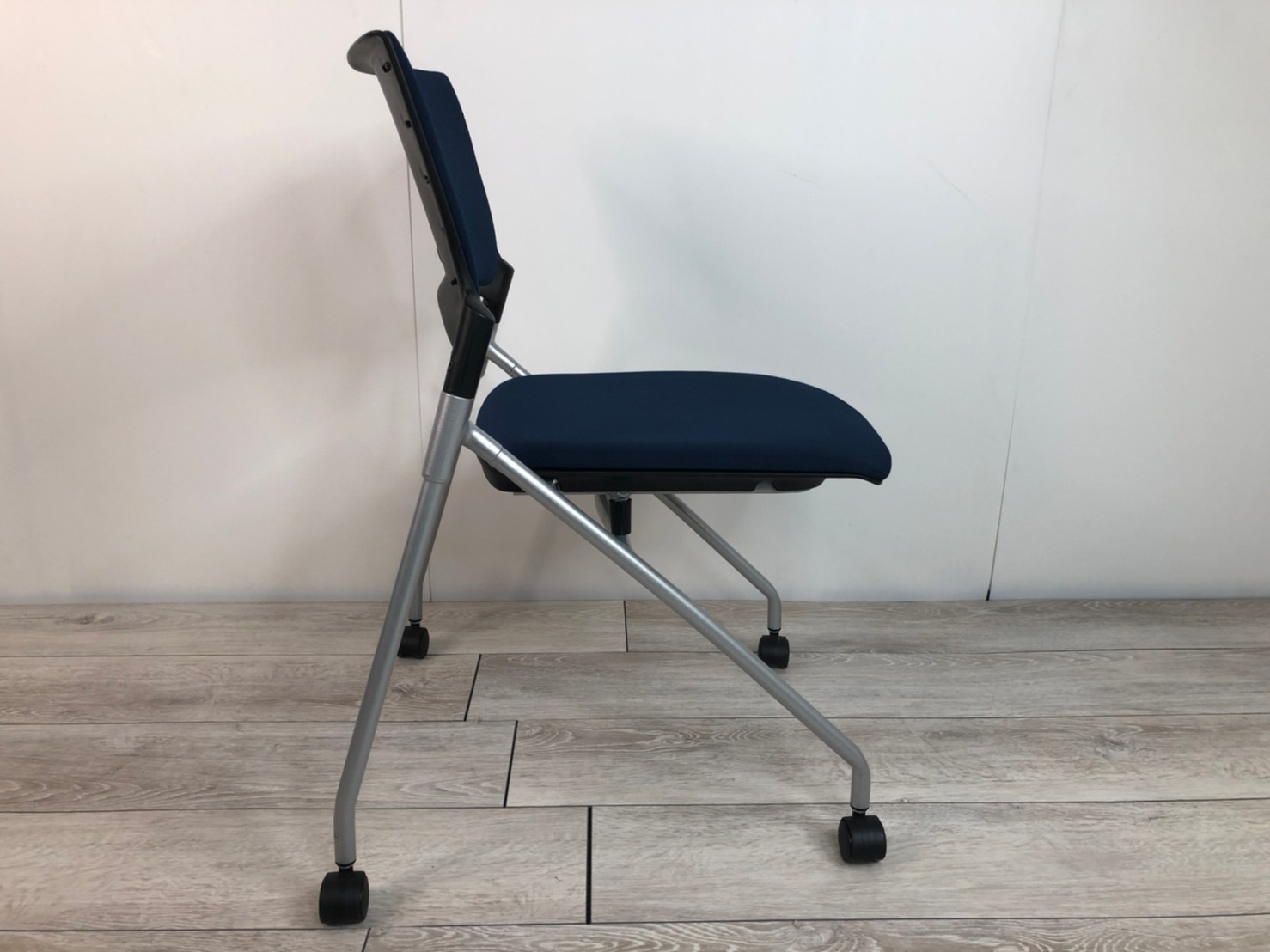 【セミナーや会議用にオススメ!平行ネスティングで省スペース化!】■イトーキ製 マノス ネスティングチェア ■背パッド付 キャスター付き ■ネイビーブルー オフィスバスターズ心斎橋店 ロット在庫