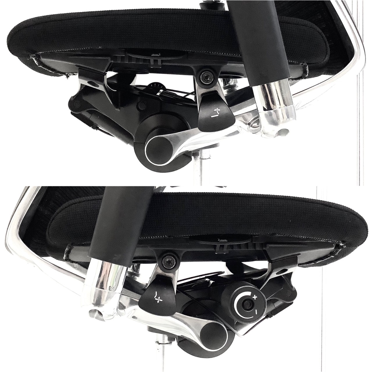 もちろん座り心地もコンテッサの直系ですから快適です。座面の素材はクッションとメッシュの2タイプあります。私、個人的には座面の中心部分でも外側でもテンションが変わらないクッション素材が、足を閉じても開いても快適なので推しです!"