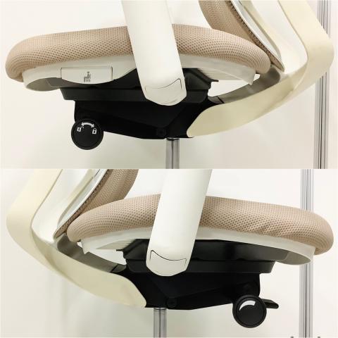 - 座面右下のダイヤル操作で、リクライニングの強弱調整が行えます。これまでのダイヤル式よりも、少ない回転数で、最弱?最強の調整が可能です。