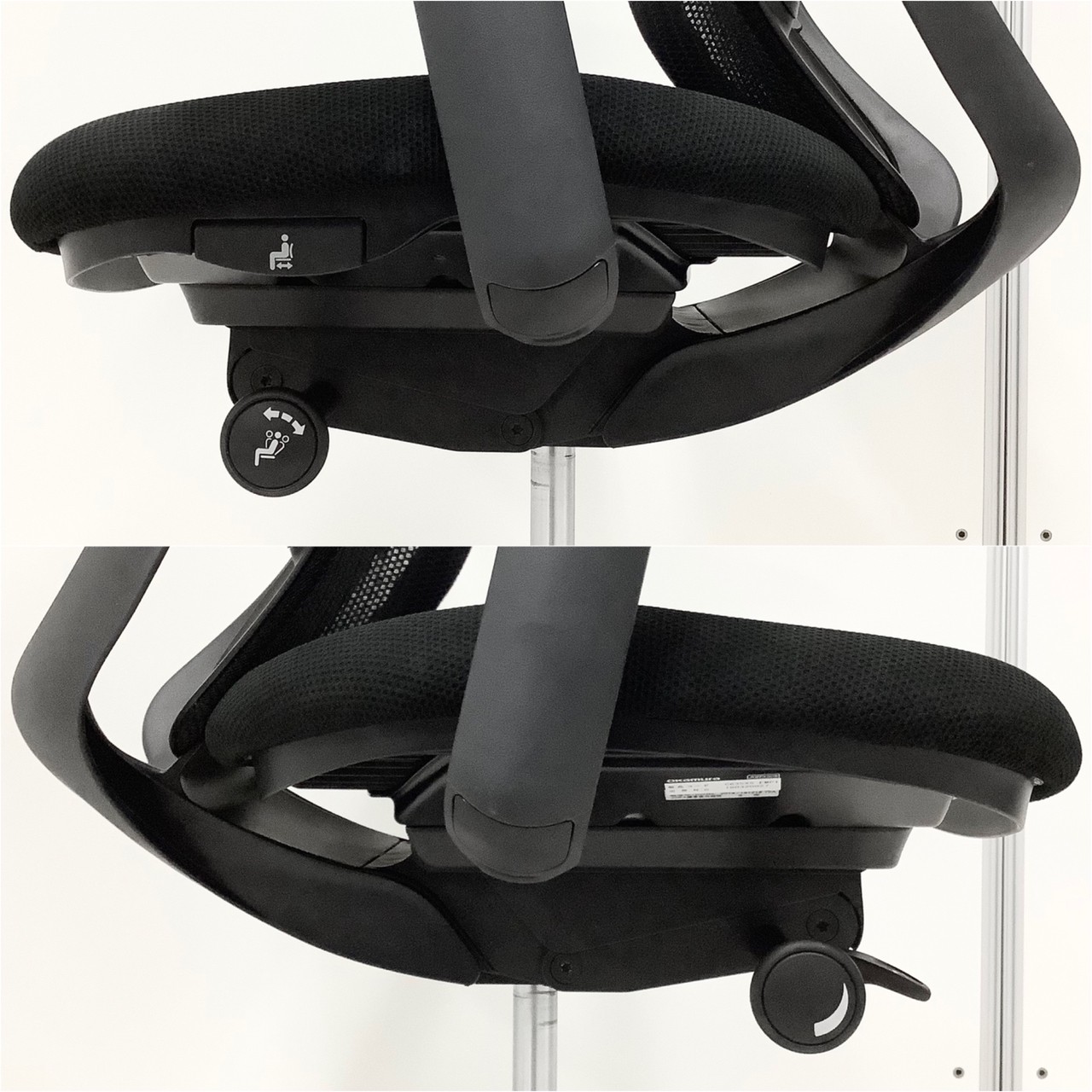- 座面の左にあるレバー操作により、座面の奥行き調整が可能です。(ストローク:50mm)