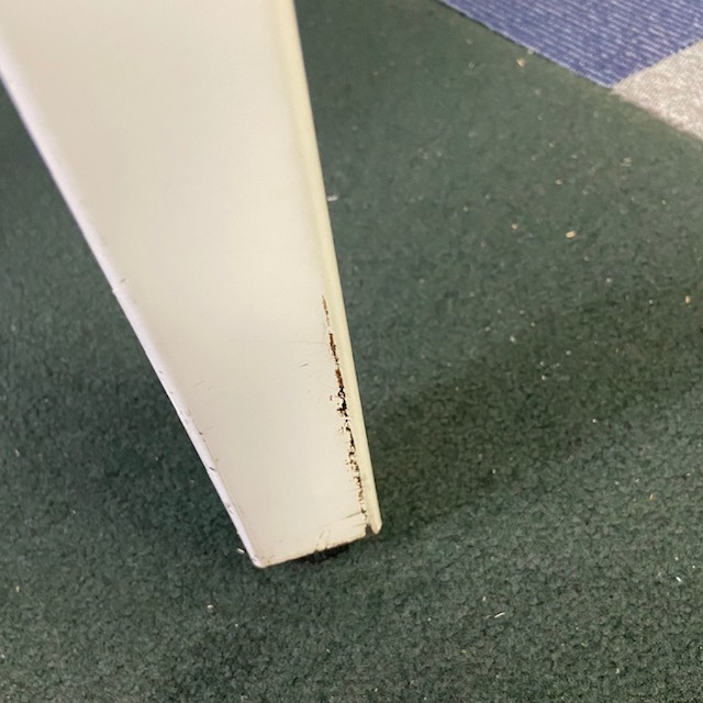 - 一部不具合あり天板歪み、アジャスター無し、キャスター使用不可ようなそのテーブルの本来の効用を果たすための機能以外の一部が使用不可な状態。(例、キャスターロッ ク機能使用不可、棚板無し等がある。)