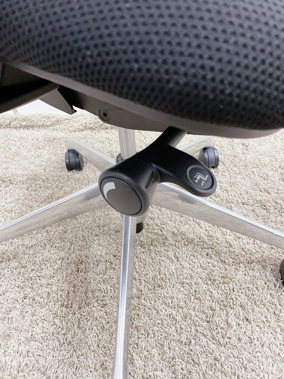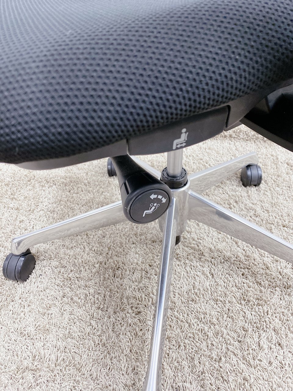 - 座面右下のダイヤル操作で、リクライニングの強弱調整が行えます。これまでのダイヤル式よりも、少ない回転数で、最弱?最強の調整が可能です。