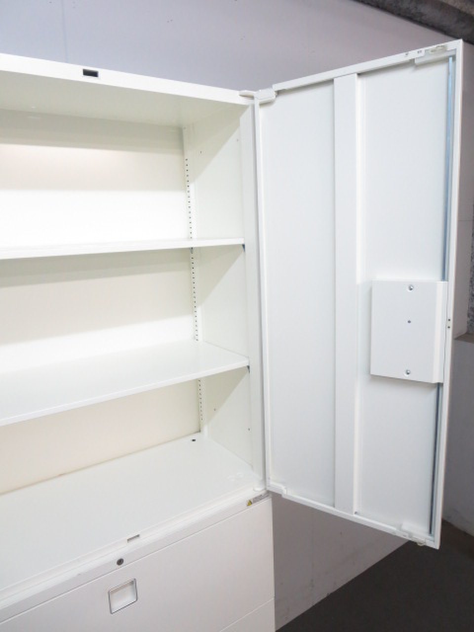 スライド式の扉+引き出しタイプの便利な書庫セットが入荷!使い勝手抜群のハイキャビネットが入荷! ■オカムラ/レクトライン/ホワイト 2枚引き戸+3段ラテラルキャビネット