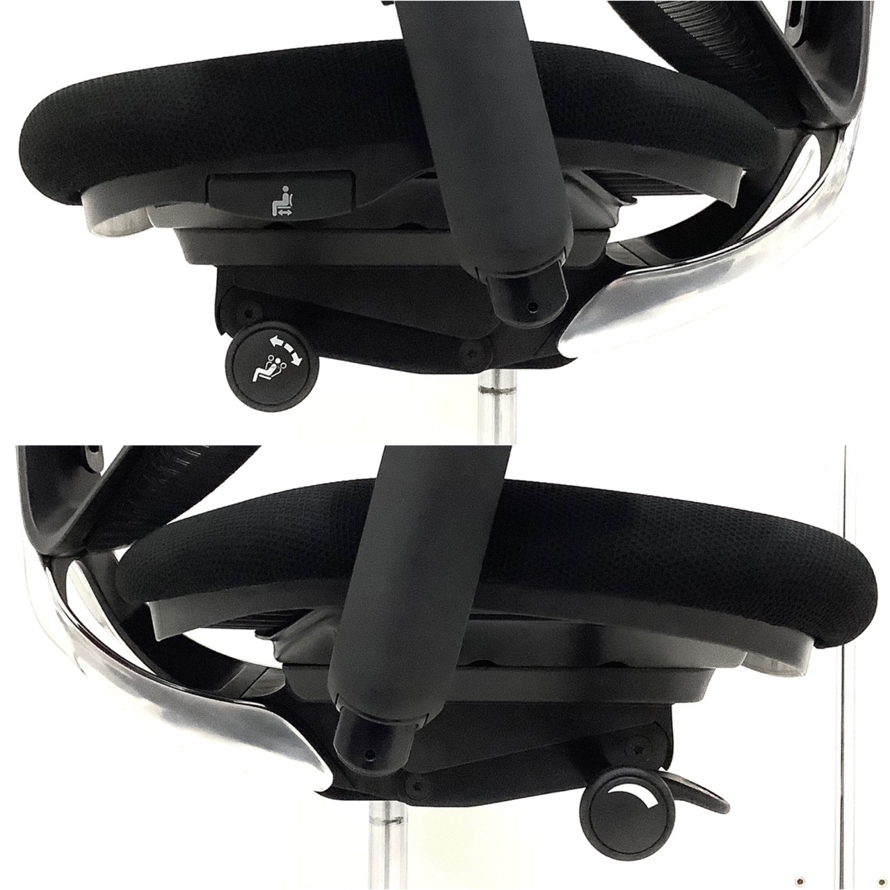 - 椅子と背が連動する「シンクロリクライニング」。リクライニング角度は直立ポジションから前方に10度、後方に23度です。
