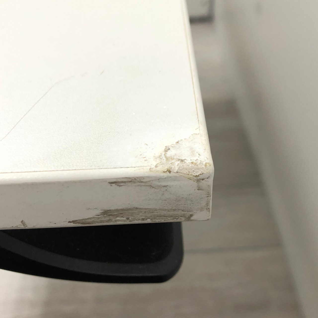 - 目立つ箇所複数あり深い傷・凹みが商品全体にある。(例、天板、幕板、棚板、サイド部分、脚部等にある。)