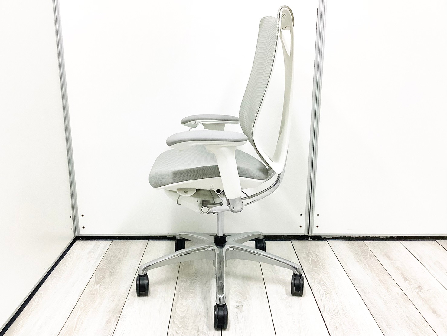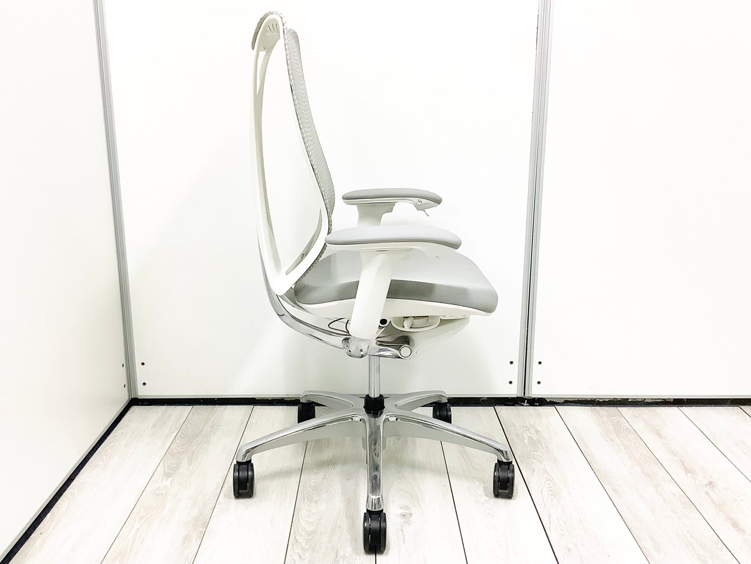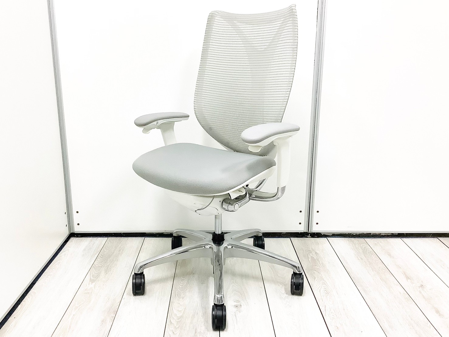 【前傾チルト付!流れるような美しいフォルムの最高級メッシュチェア!】■オカムラ(okamura)製 Sabrina(サブリナ)チェア 肘付ハイバック ■アジャストアーム(可動肘) ■背面メッシュ ■ライトグレー × ホワイトフレーム