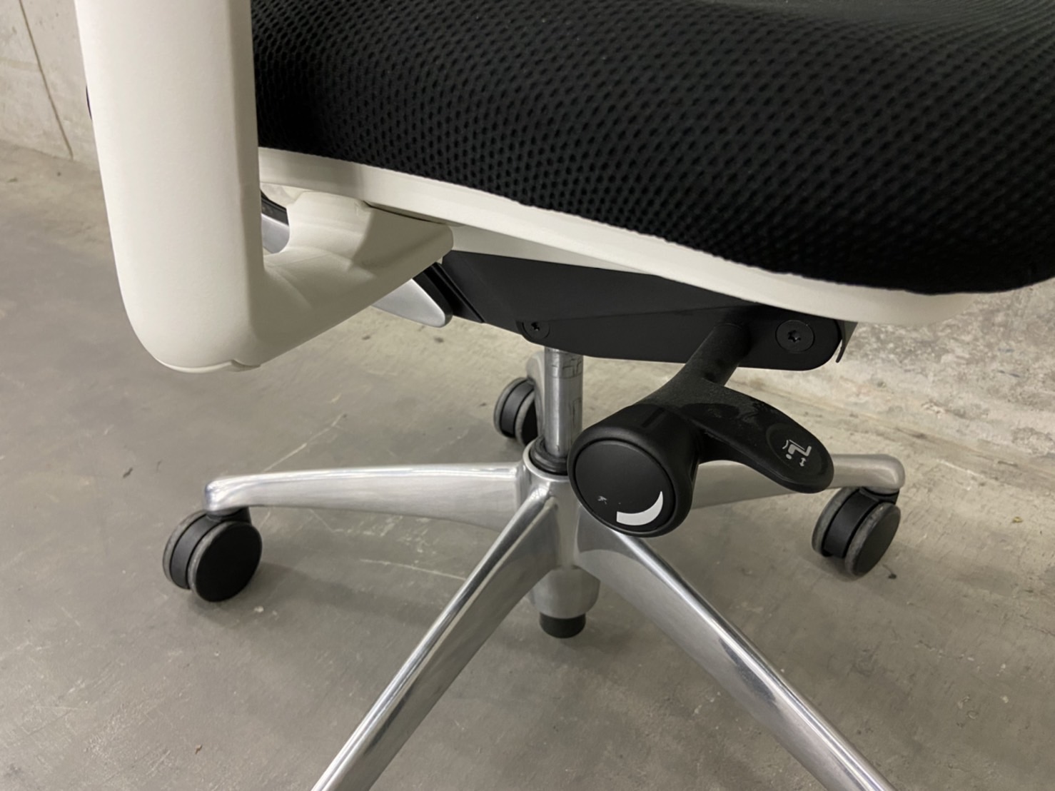 - 椅子と背が連動する「シンクロリクライニング」。リクライニング角度は直立ポジションから前方に10度、後方に23度です。
