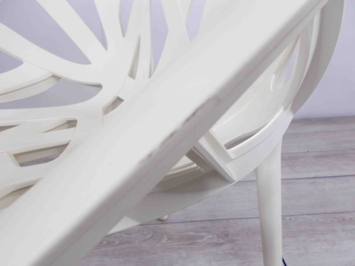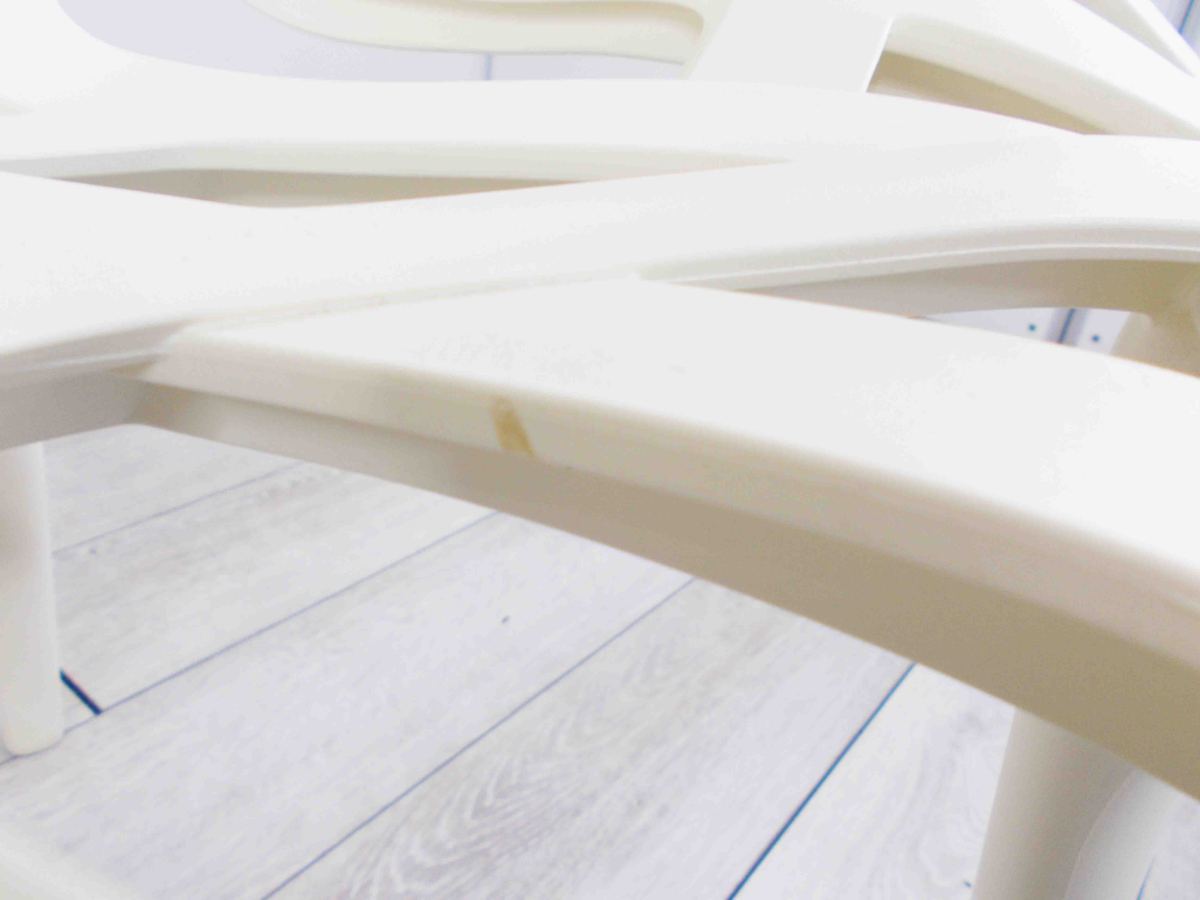 - かなり強い濃い黄ばみ・変色が商品全体にある。(例、座面・背もたれ、脚部等にある。)