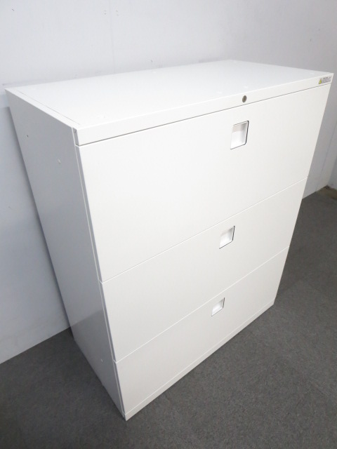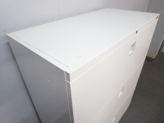 オカムラ レクトライン 3段ラテラル書庫 ホワイト天板 シリンダー錠 鍵付き ※取っ手部分に若干日焼けあり