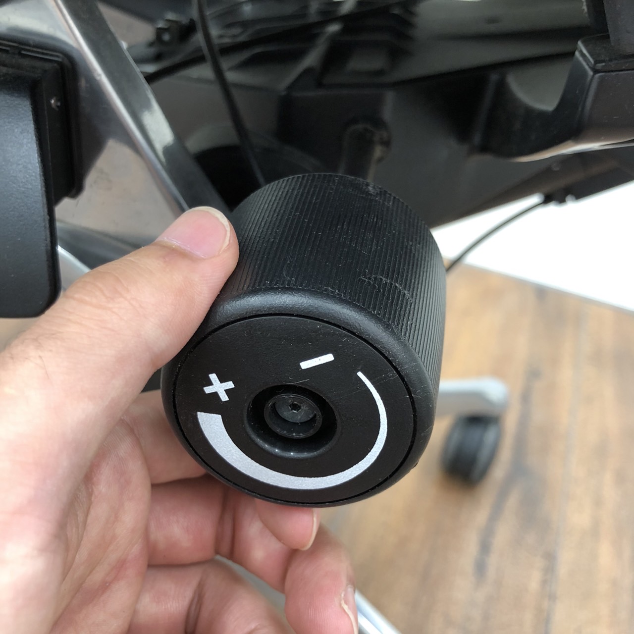 右手を座面下に下ろした位置にあるダイアルでお好みの強度に調節可能です。