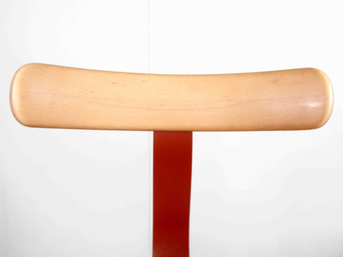 Tチェアは無垢材を3次元に削り出した座面と背もたれで出来ていて、弾力性のあるスチールで背と座を繋げることにより快適なすわり心地を実現させています。