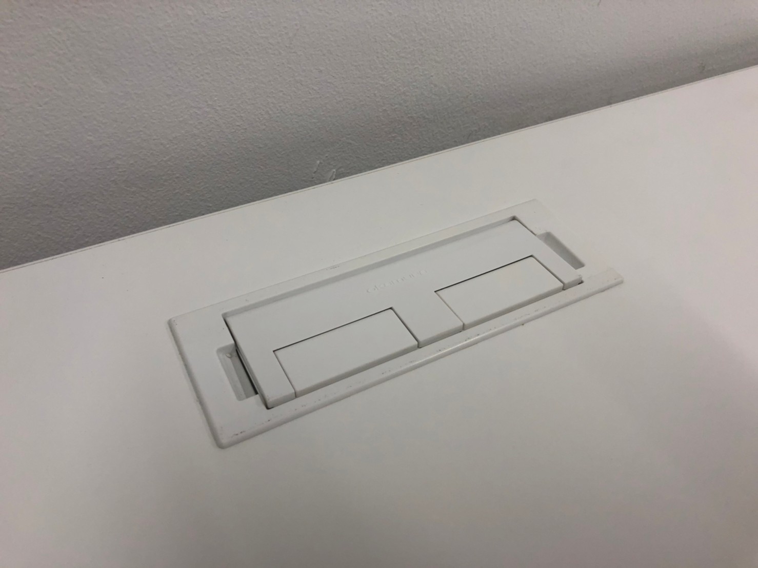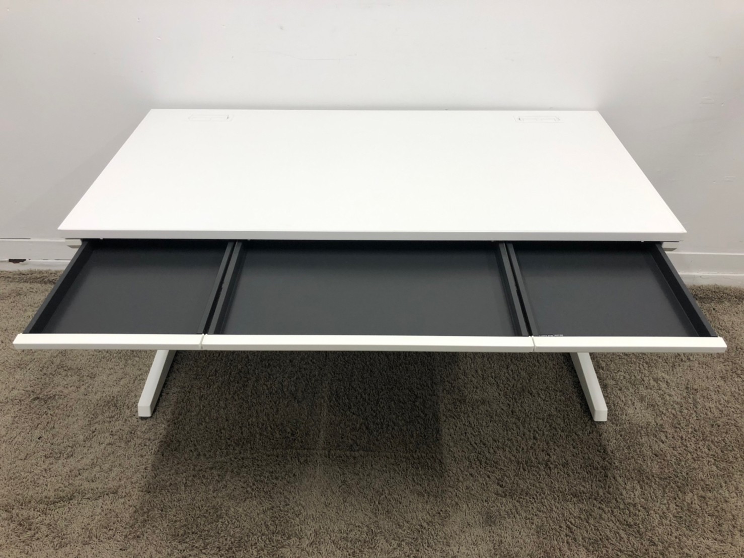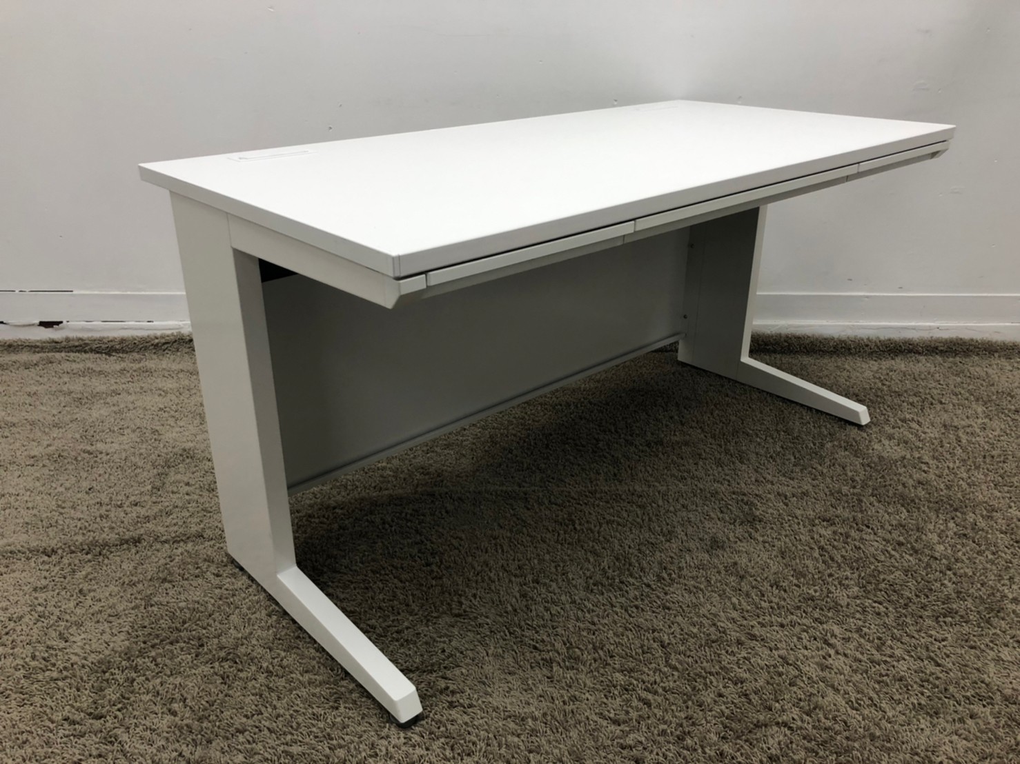 オカムラ アドバンス-Sデスク 平机 センター引出し付 人気のホワイト天板 ゆったりめのサイズのW1400 配線孔2カ所 ※樹脂部分に日焼けあり 【愛知・名古屋・豊田・静岡・浜松】
