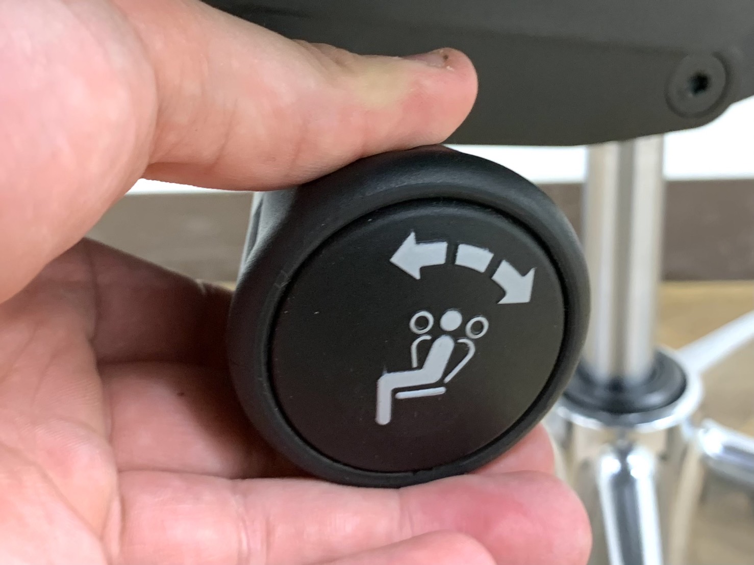 - 椅子と背が連動する「シンクロリクライニング」。リクライニング角度は直立ポジションから前方に10度、後方に23度です。