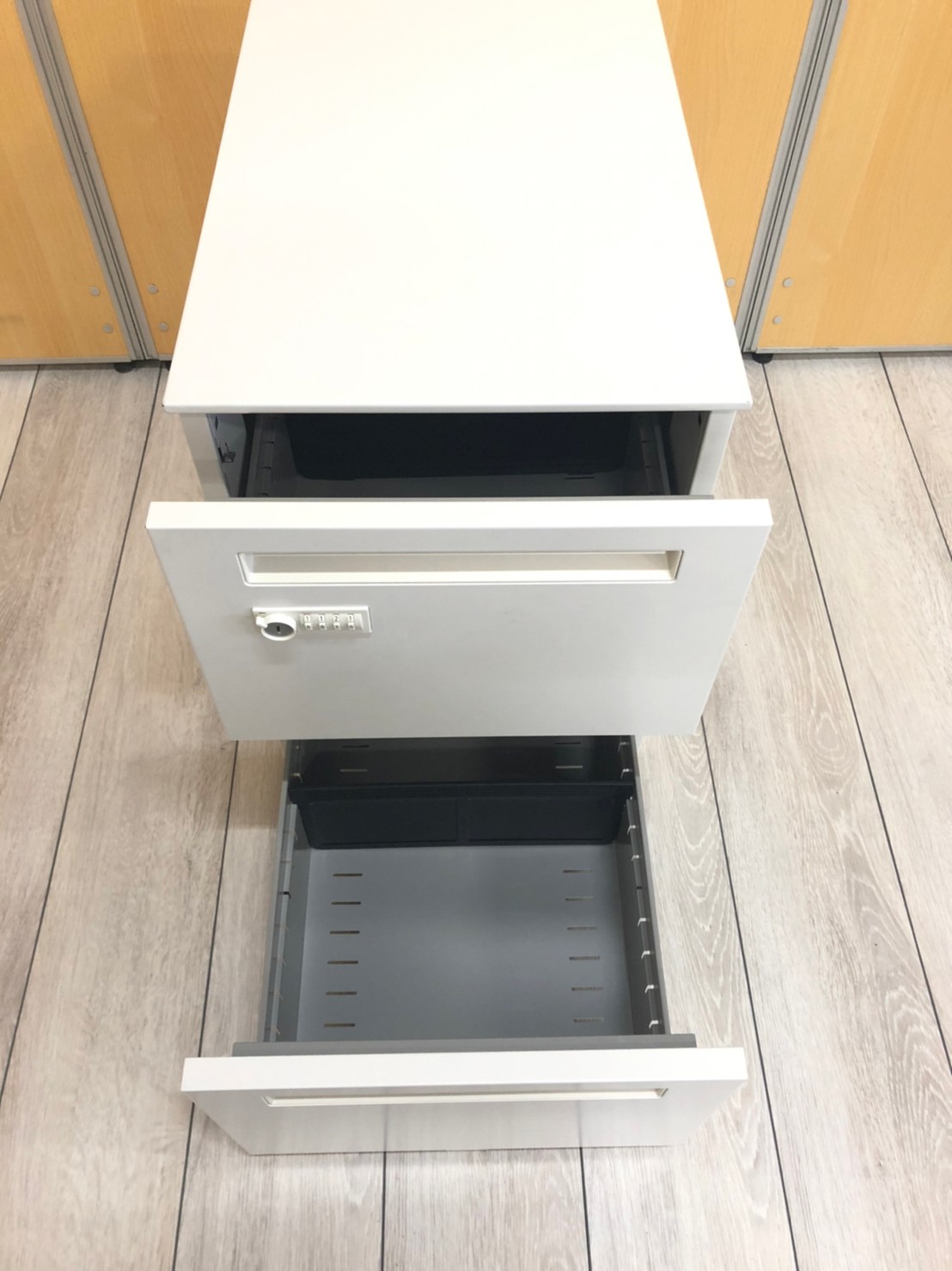 - 一部不具合ありその脇机・ワゴンの本来の効用を果たすための機能以外の一部が使用不可な状態。(例、引出が開閉しづらい、 キャスターロック機能使用不可、ラッチ不良 等がある。)